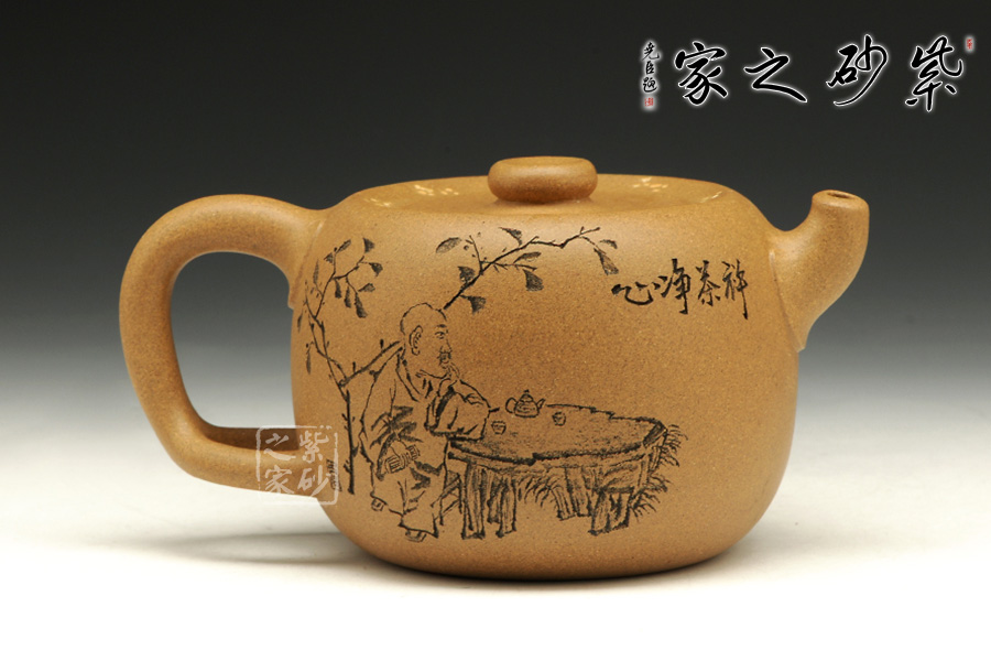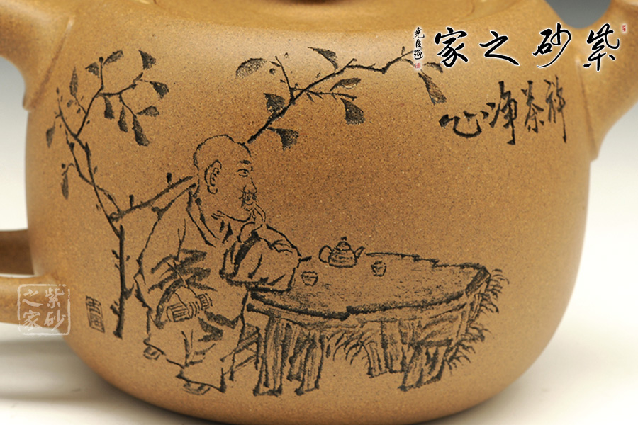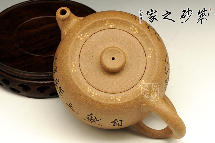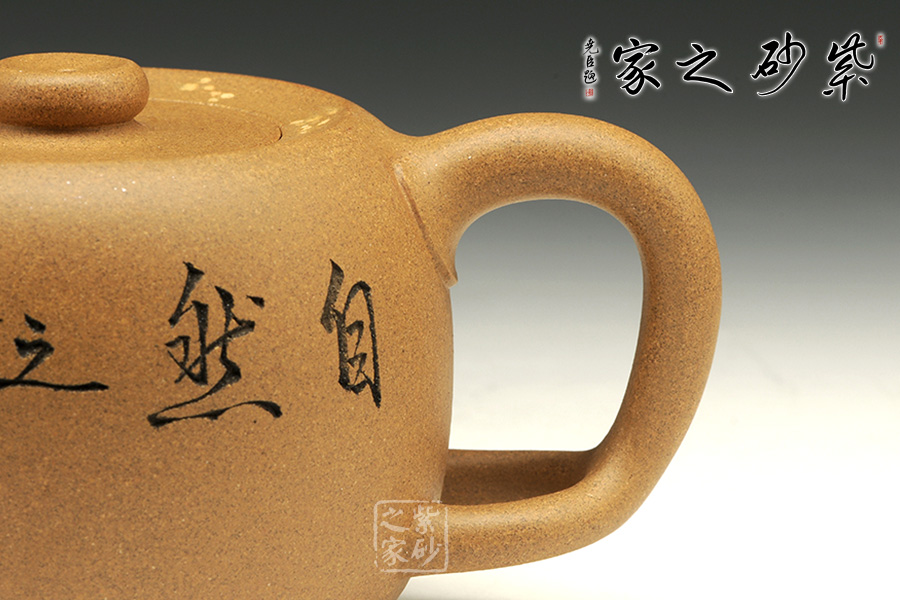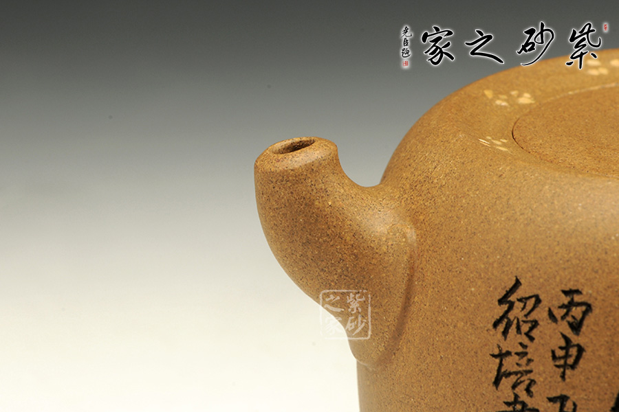 此壺造型古樸,沉穩(wěn)內(nèi)斂,粗礦的泥質(zhì)給人一種憨厚自然之感。大肚圓融的壺身,線條飽腹,獨以養(yǎng)韻。配以短流厚重的壺嘴以及肥端的壺把,更添一份憨然可掬。壺蓋造型別致,內(nèi)凹,大口。泡茶品茗,自有玩味!