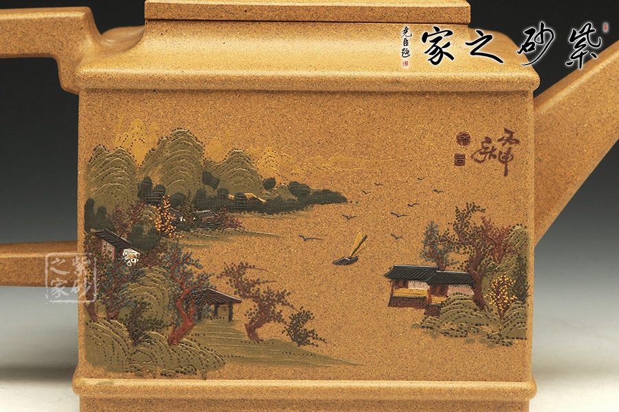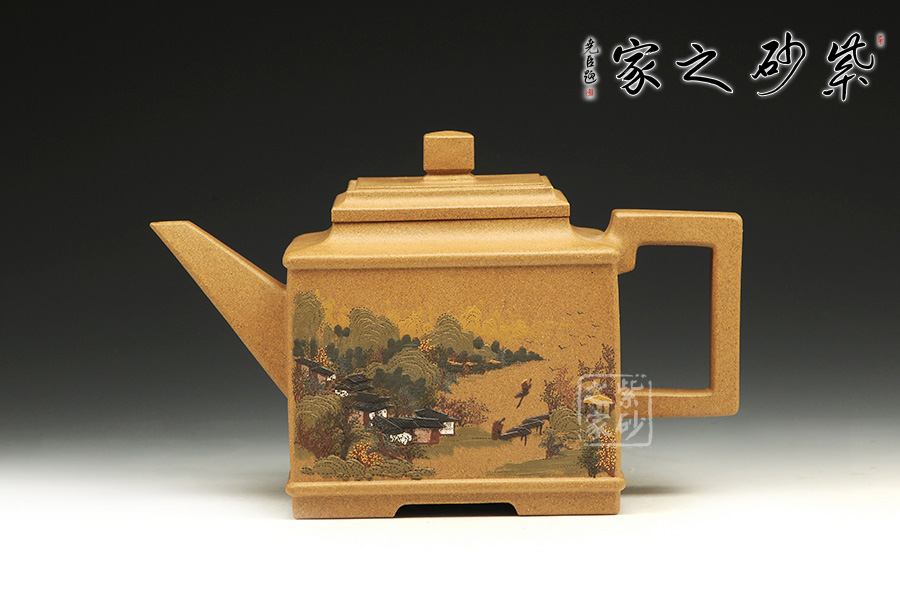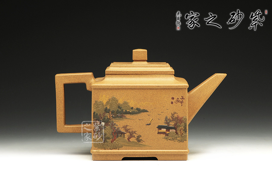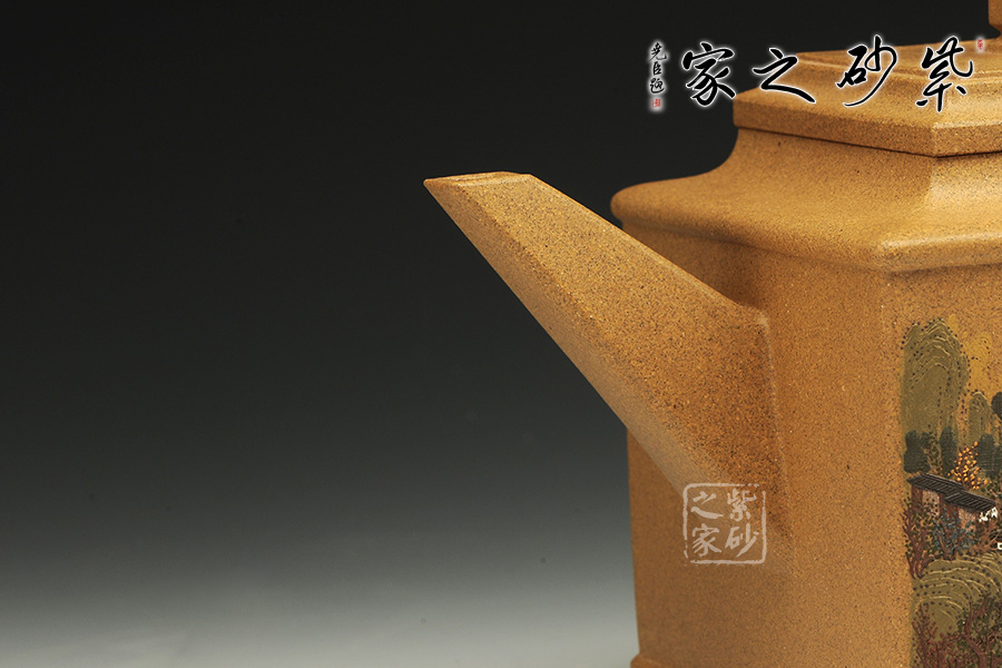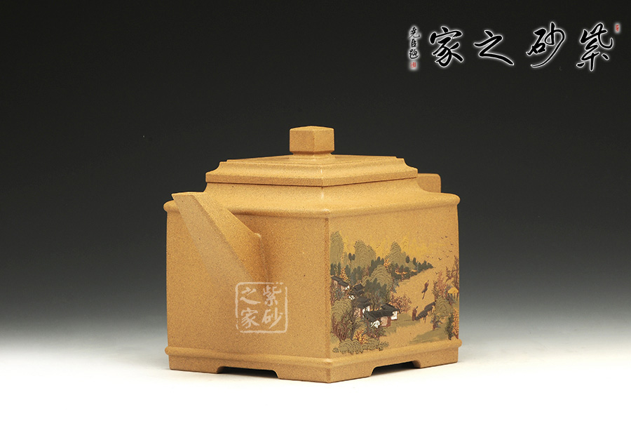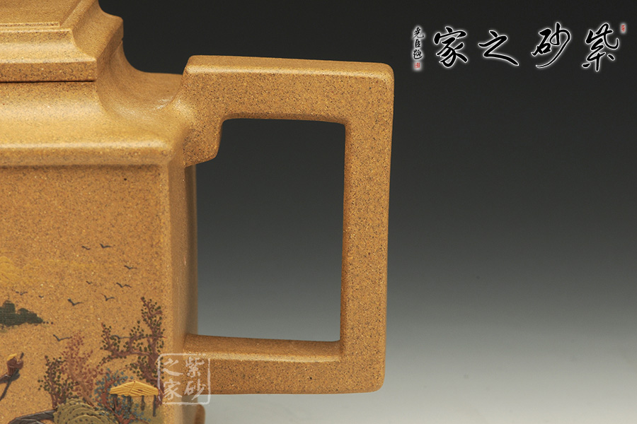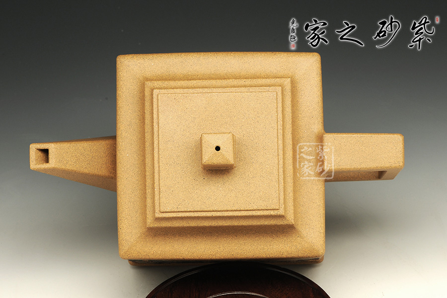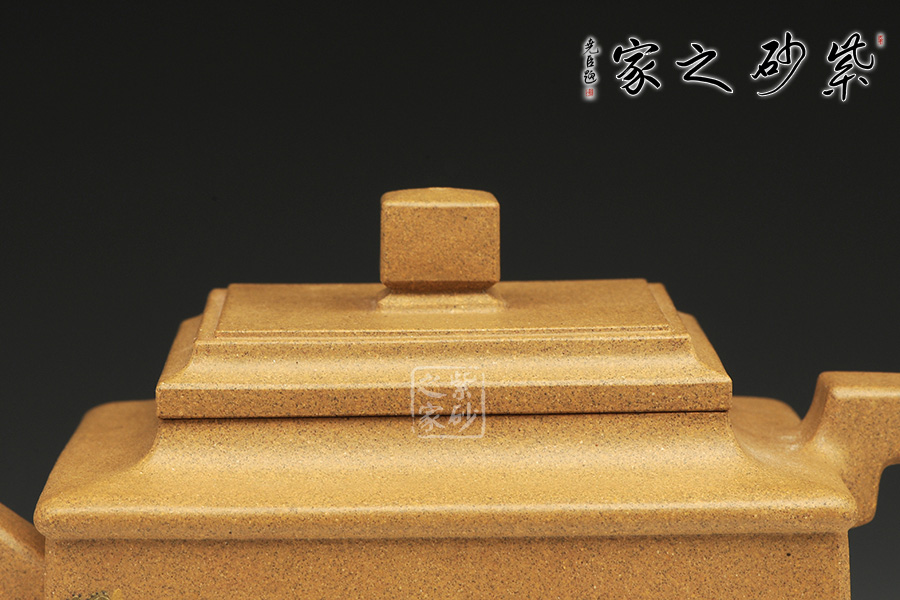 壺身為正四方型,四面皆平整光滑,棱角線條筆直如刀切。四足平整,一條線將下部分隔開(kāi)來(lái),工整的美感更突出。肩部寬闊水平,壓蓋為分層設(shè)計(jì),工整的線條逐級(jí)抬升,至壺鈕部位成一顆方型珠,恰好與壺身造型大小對(duì)應(yīng)。壺把四方外觀,盡顯干練,壺嘴粗細(xì)過(guò)渡中有爽利的氣勢(shì)。