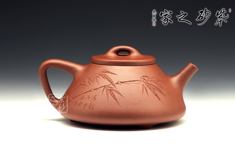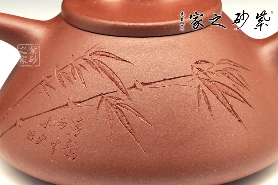 此壺為經(jīng)典的石瓢造型,此壺下大上小呈三角形,周身皆以圓弧線條構(gòu)成,流、把、鈕處處銜接自然流暢,線條清爽利落,起承轉(zhuǎn)合自如得體。壺嘴、壺把、壺身三位一體。底部三圓足立起全身,使壺顯得挺括有神,展露出一種大氣風(fēng)范。壺面詩(shī)詞,字簡(jiǎn)意深,配合修竹,展現(xiàn)出文人氣派,值得賞玩收藏。