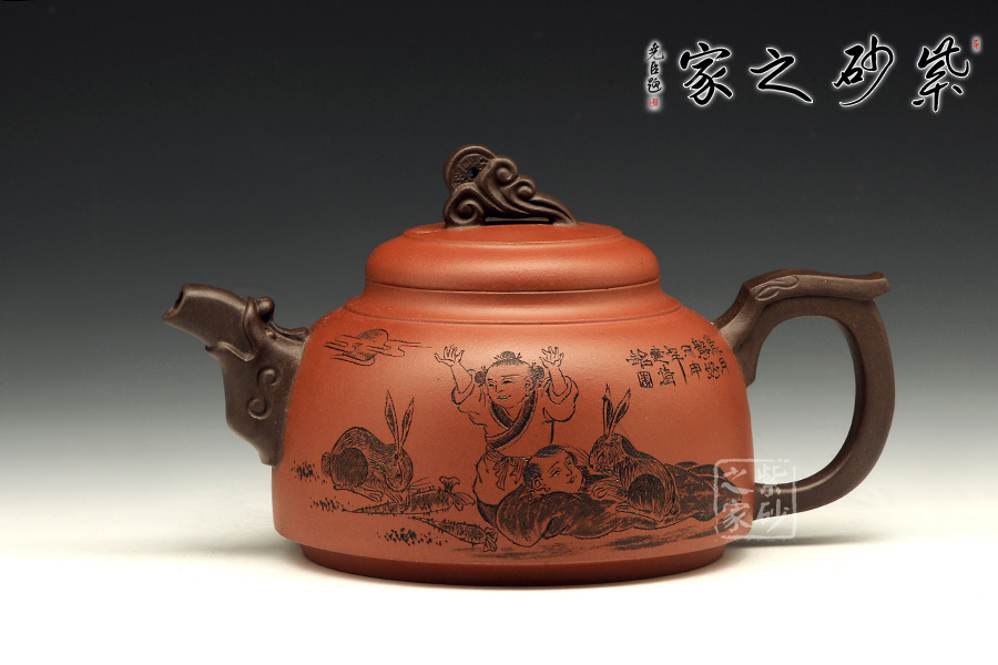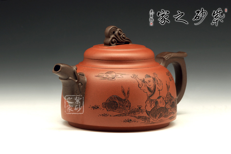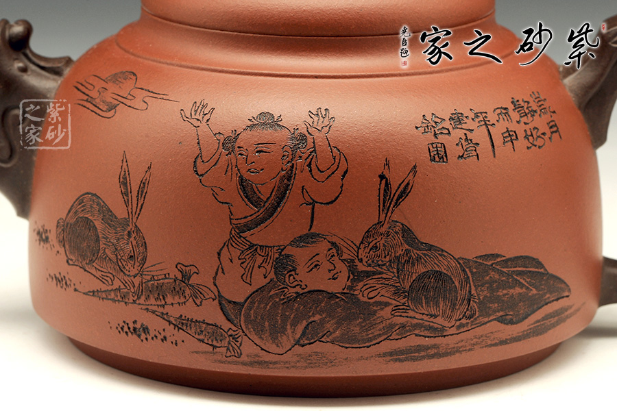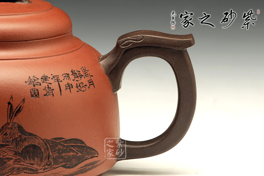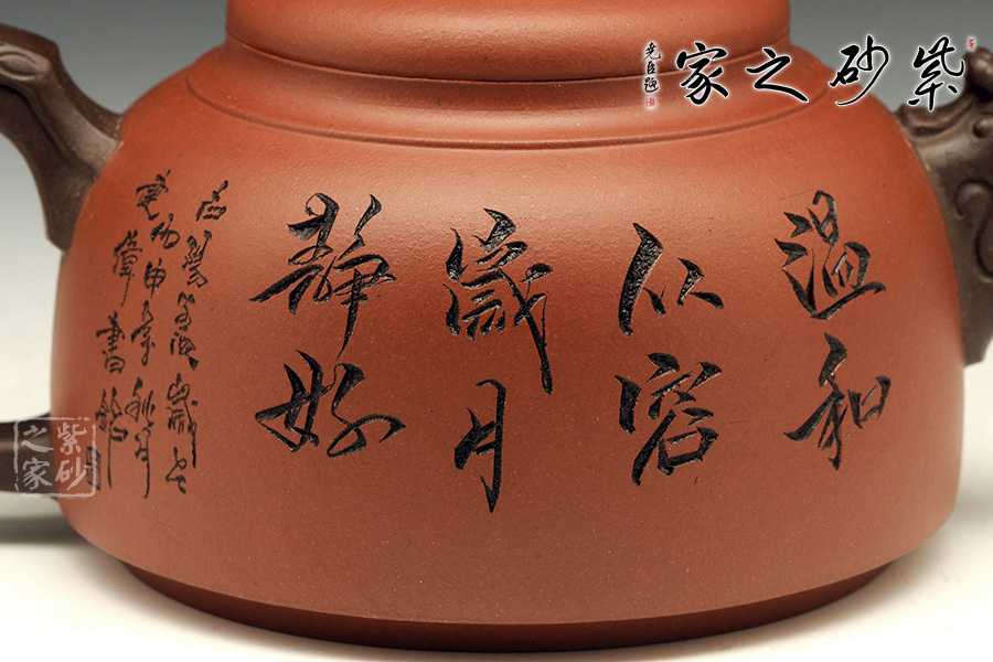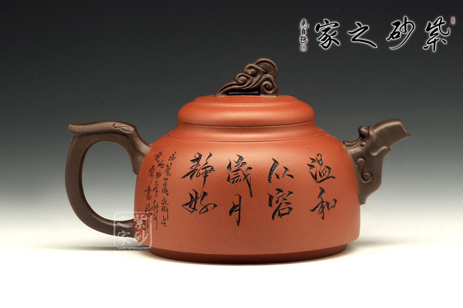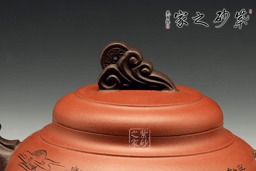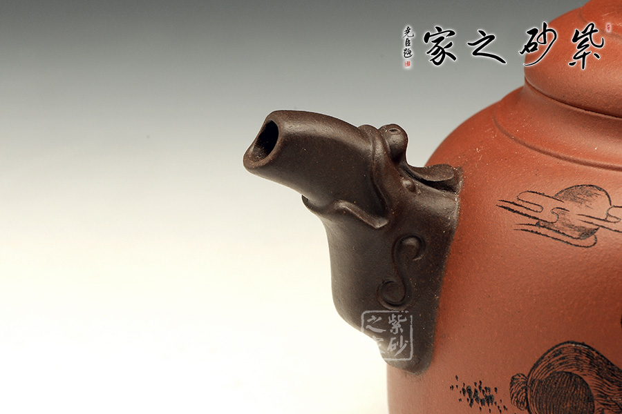 雙色泥料使用,交相輝映下足見作者功力不凡。壺身造型圓潤(rùn)挺拔,平滑直線和曲線過渡自然,工整細(xì)膩。此壺以硬朗的直線為主,挺拔工整,又透出圓潤(rùn)的溫婉。造型別致,值得收藏。壺鈕如意裝飾,壺嘴壺把以龍形為素,刻畫生動(dòng)形象,相互交映。