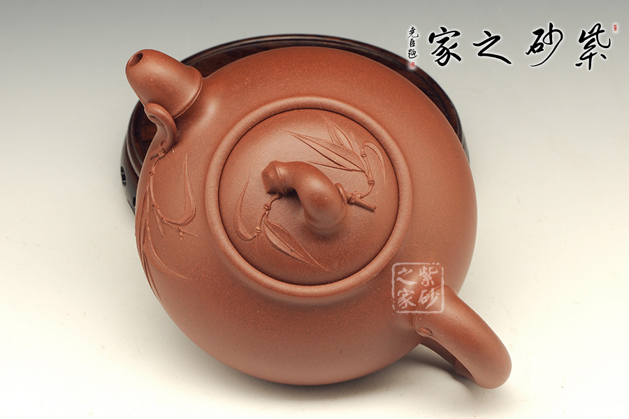壺嘴竹節(jié)上一直竹枝伸出,幾片竹葉隨風(fēng)招展,覆蓋在壺的表面。整潔光亮的壺身平添了一絲清新逸趣。壺鈕微鼓,嵌蓋式,完全沒落壺內(nèi),只留一小寶蓋頂凸在壺口外。若隱若現(xiàn)中顯示出壺把玩韻味。