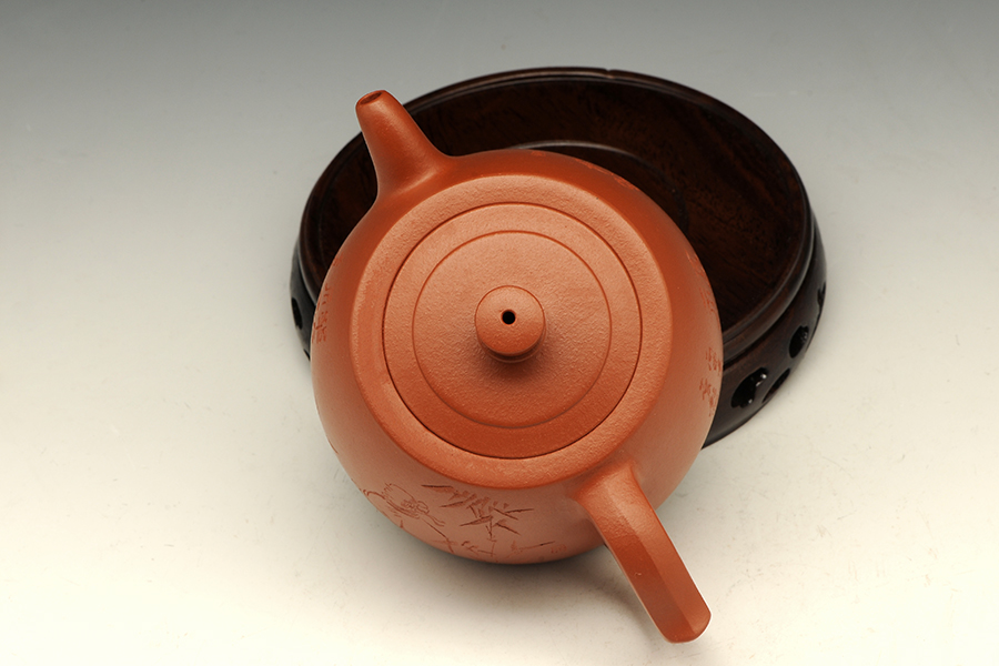 此壺色澤低沉穩(wěn)重,砂質(zhì)細(xì)膩柔滑。造型簡潔,身若井欄,嵌蓋平緩合體,高柱鈕與壺身統(tǒng)一,一彎嘴曲而微妙。把圈大,外扁平,里圓潤,底圓而大。其造型為最早的流線型設(shè)計(jì),端把傾注觸覺舒適,屬“曼生壺”式的經(jīng)典之作。如此一把精致好壺可不管是自用還是饋贈(zèng)皆適宜。