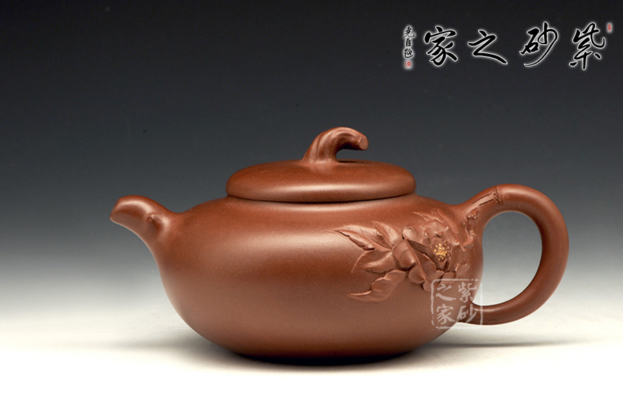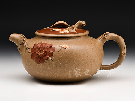 壺身繼承傳統(tǒng)的圓器形態(tài),輪廓飽滿,線條圓潤,似一只誘人的桃,又像是待放的花苞。壓蓋之上平整光滑,如同鏡光湖面。一朵紅艷的牡丹花做壺鈕,嬌艷欲滴,傾國傾城的美態(tài)讓人過目難忘。彎流壺嘴凝重內(nèi)斂,氣勢(shì)渾厚,以枝節(jié)的形態(tài)裝飾,更清新。倒把設(shè)計(jì),枝葉包裹外面,貼花的牡丹葉片,更添情趣。