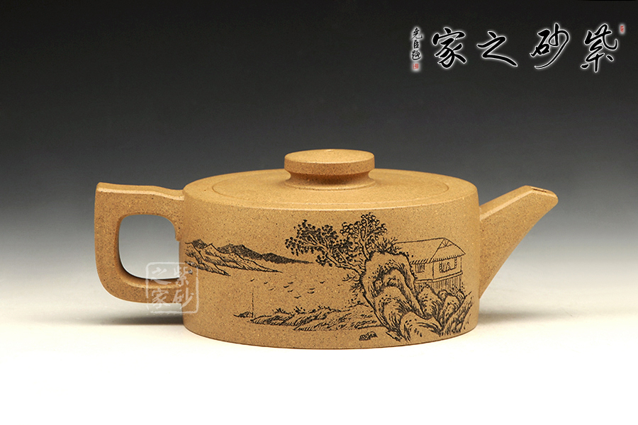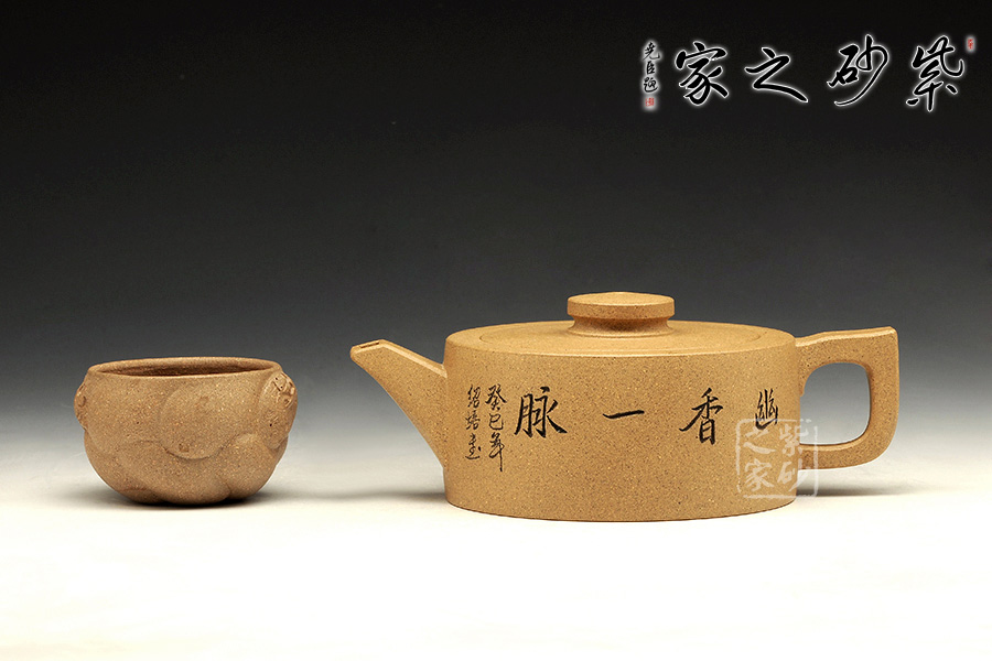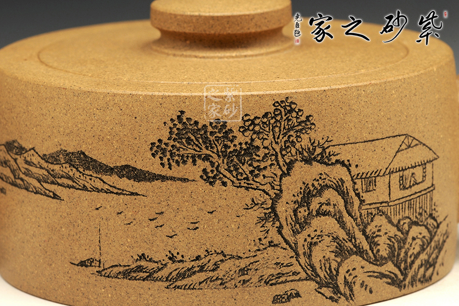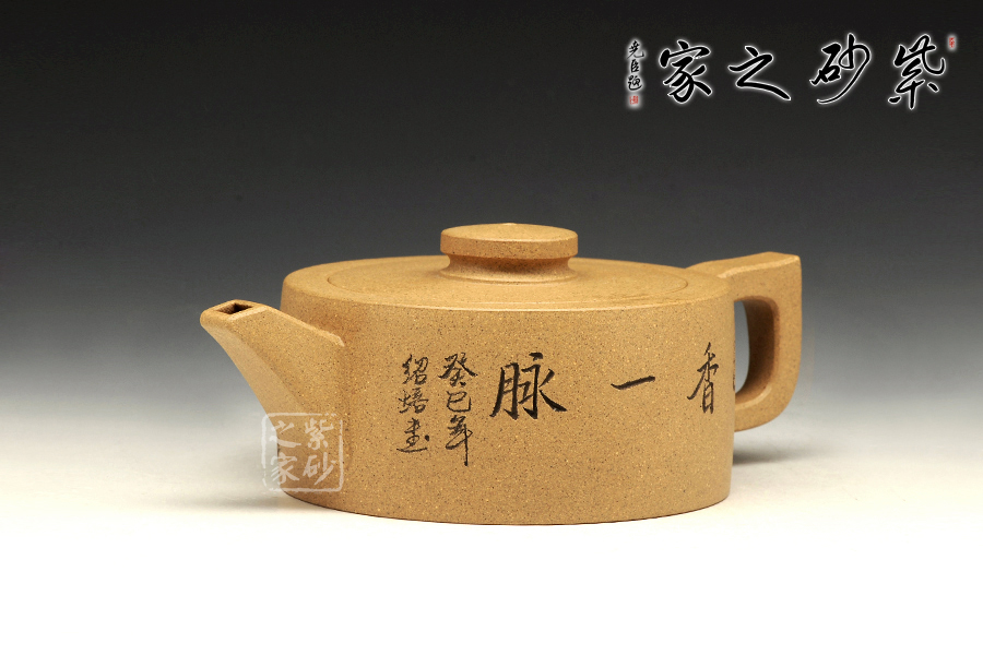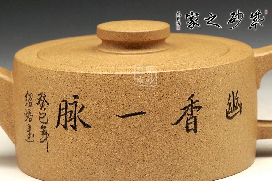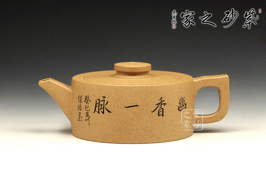 此壺造型簡(jiǎn)練,圓盤(pán)器型,壺鈕與壺身相互襯托,清雅自然。壺正面刻繪的是“幽香一脈”四個(gè)大字,字體典雅大氣,所傳遞的深刻哲理,耐人尋味。壺反面刻繪的是一幅山水,怡然自得,煙波渺渺。該壺是紫砂壺中的實(shí)用品,也是紫砂壺中的藝術(shù)品,值得珍藏。