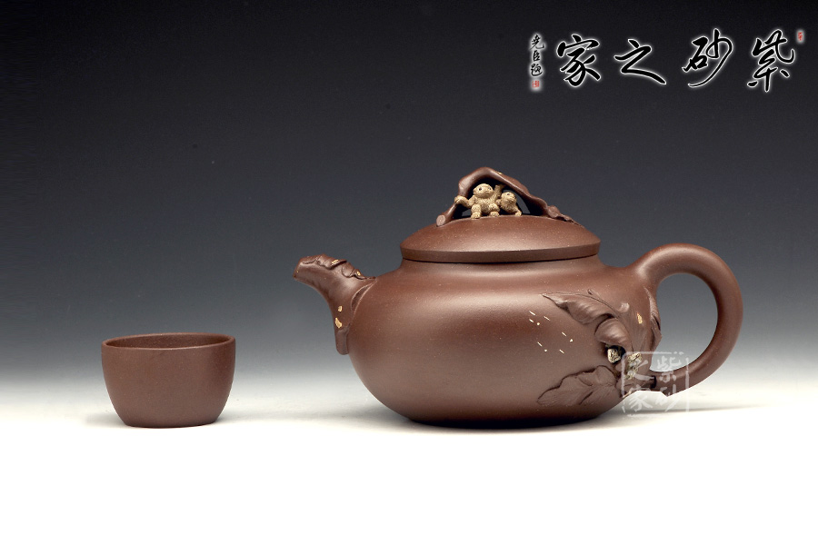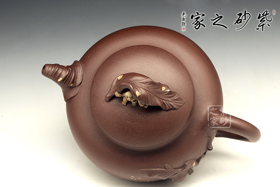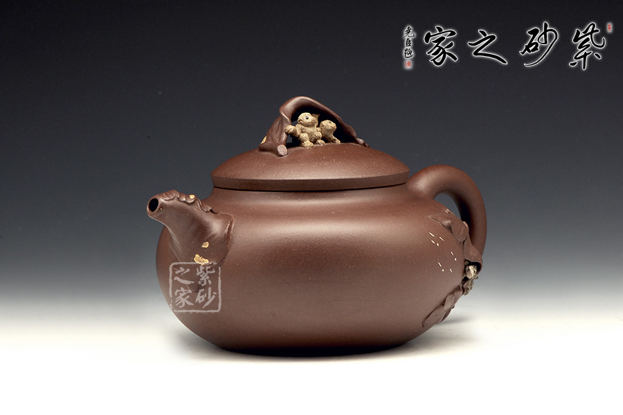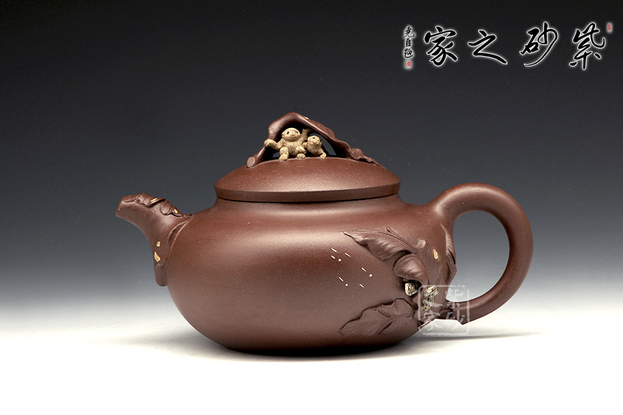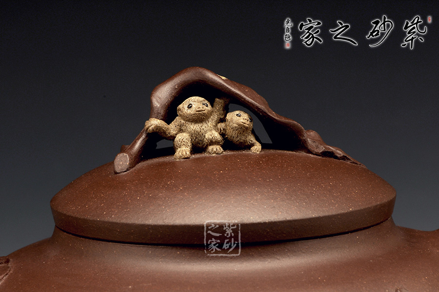 壺嘴則若南瓜葉包裹而成,精巧別致,創(chuàng)意極新。壺把處一南瓜葉子胥出,蒼老卻不失神氣。壺蓋上兩只猴子尤其動人,一只趴在壺蓋上,悠閑自在,一只坐在上面,撐著葉子,神態(tài)憨厚。品玩此物,不知不覺人就心情爽朗,會心一笑。