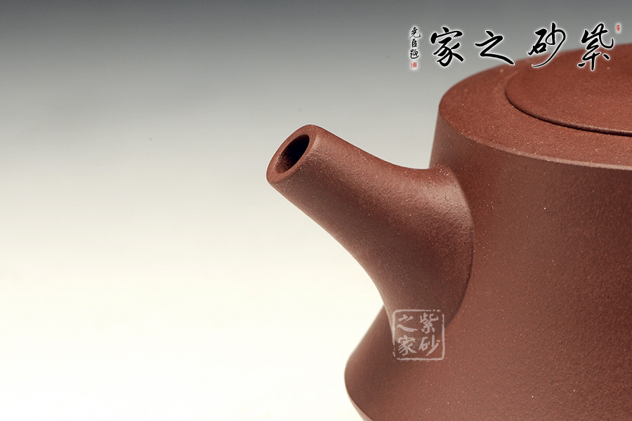 此壺做工很細致,色澤古雅,底蘊十足。整款壺為柱形,上窄下寬,壺底如同一個盤子與壺身相接而成,壺身向內(nèi)凹陷,力蘊十足。同時,一變嘴扁平而修長,也是向內(nèi)凹陷,嘴口朝天,壺嘴上側(cè)為弧面,造型別致。而飛把呈倒耳形,拿捏方便。圓的子,嵌蓋,氣密性極好,歷久彌新,足見功力。