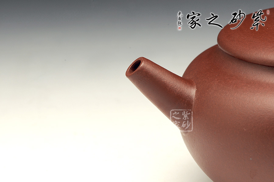 平蓋壓口,子母線咬合緊密,在倒茶時(shí)不擔(dān)心水溢出,實(shí)用性價(jià)值高。直流嘴如珠炮噴薄而出,力度十足,出、斷水極其利索。耳形壺把與柔圓的形身相呼應(yīng)。作品重氣求精,形體端莊,線條流暢,很有其神韻。