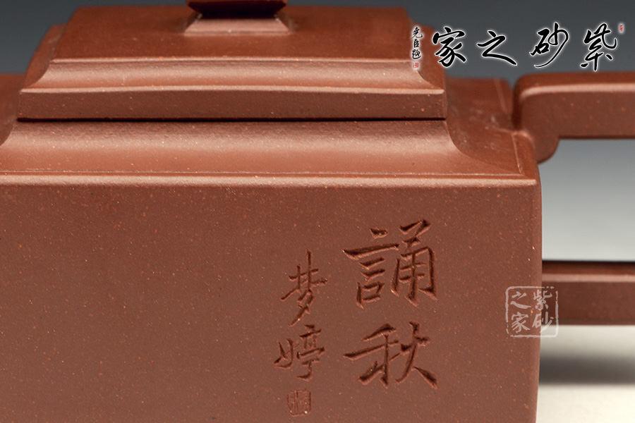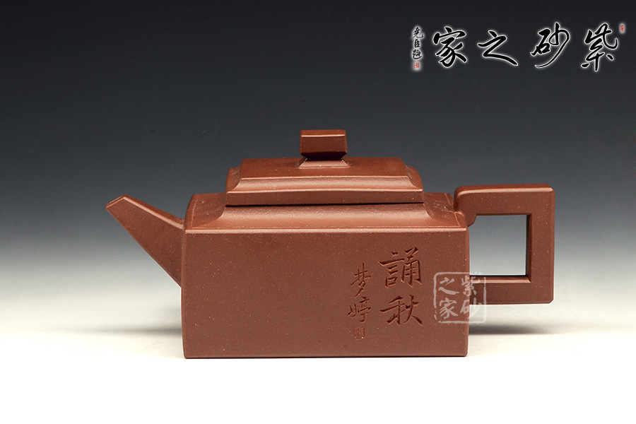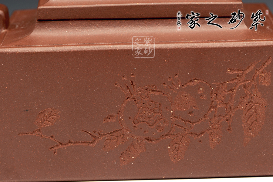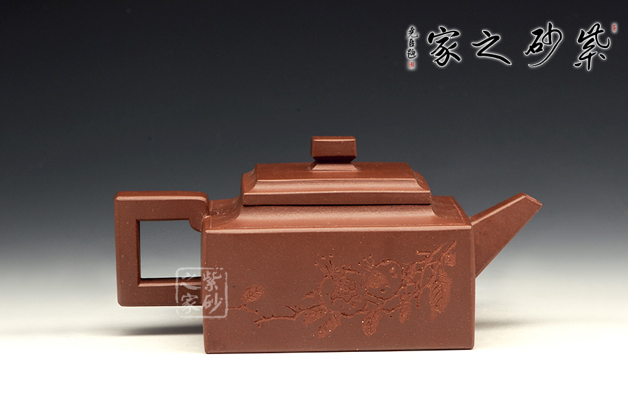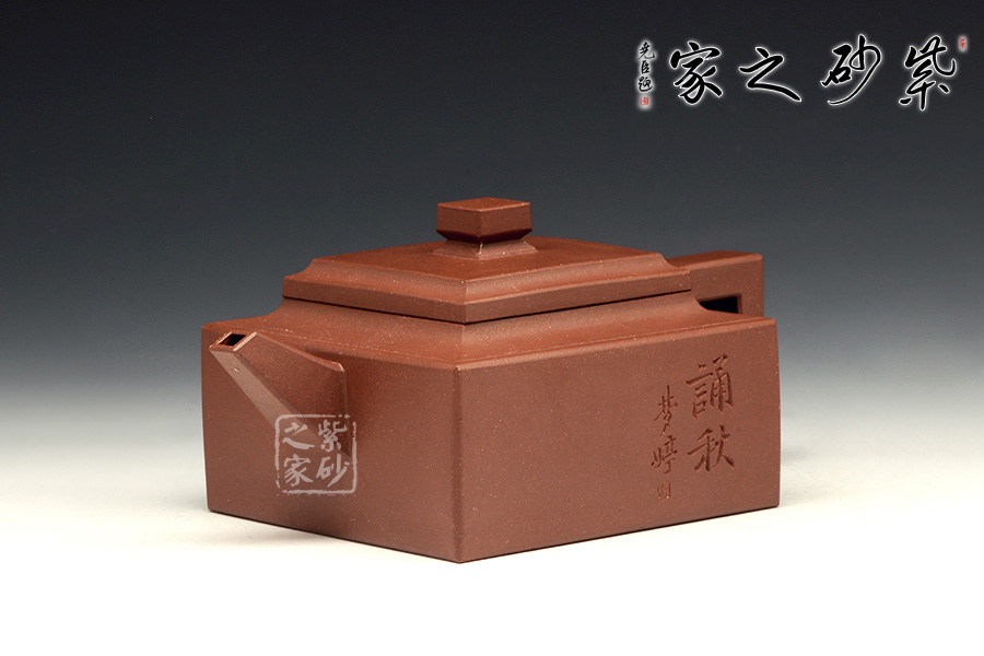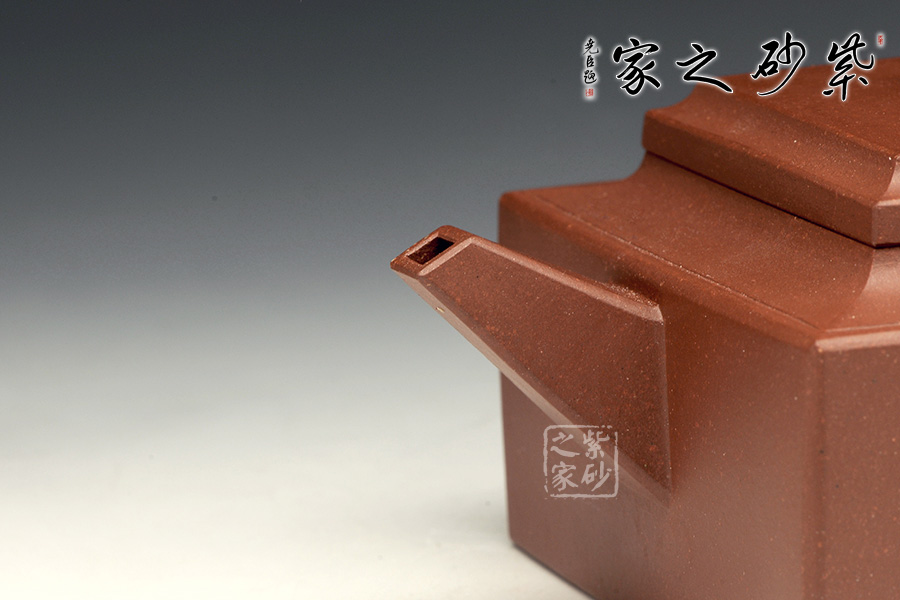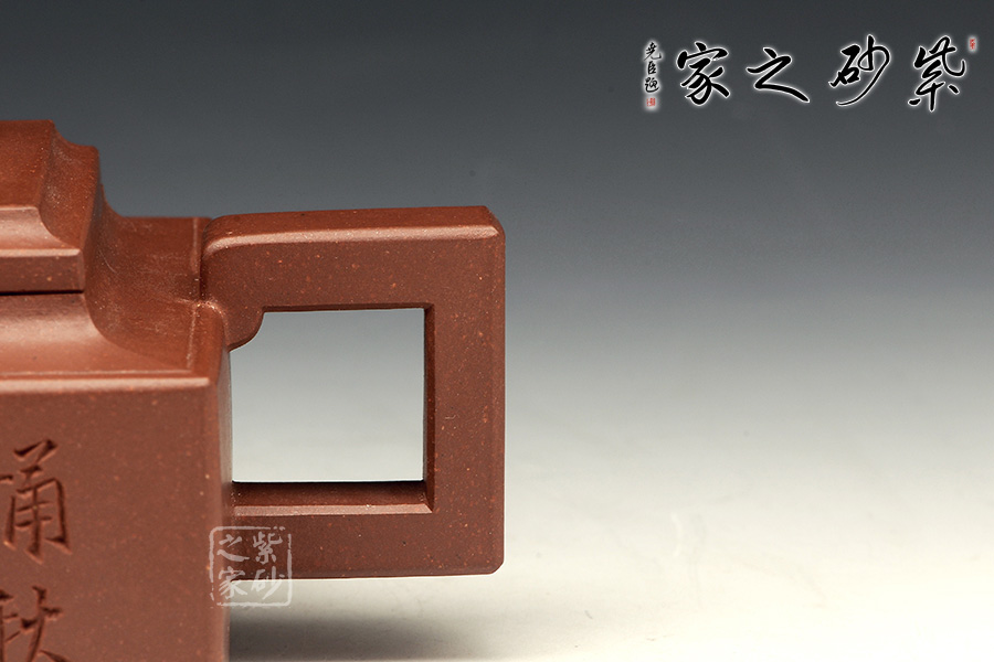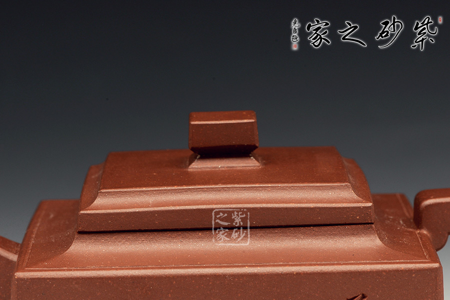 此壺是經(jīng)典的紫砂方器。壺身呈現(xiàn)長方形,規(guī)整大氣。精選原礦底槽青泥料制成,泥質(zhì)醇厚,色澤古穆,觸手生溫。方的元素在此壺中運(yùn)用得大氣磅礴,層次感非常豐富??傮w來說,此壺的氣韻就非常高雅。