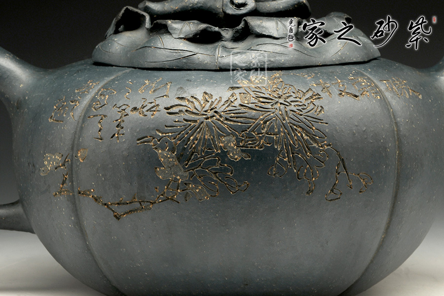 整把壺就是一枚柿子,壺身為柿子,壺蓋是葉片,壺嘴和壺把則是樹枝。壺身的柿子外觀飽滿,線條清晰,正是熟透的模樣。壺蓋上的葉片紋理清晰,褶皺逼真。壺把和壺嘴樹枝節(jié)點分明動人。壺蓋上的葉片紋理清晰,褶皺逼真。整器田園雅趣,更顯得真實,葉片根枝,果實而出。