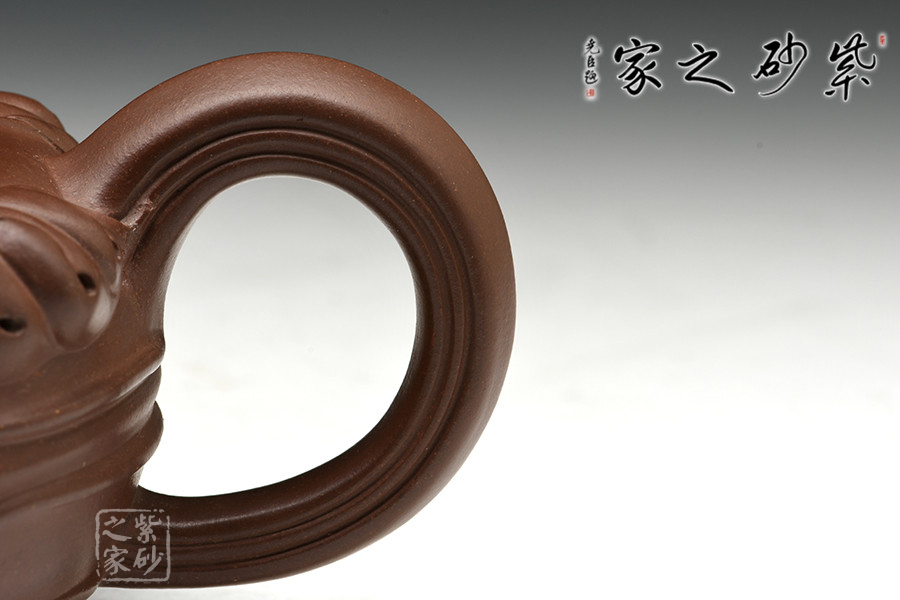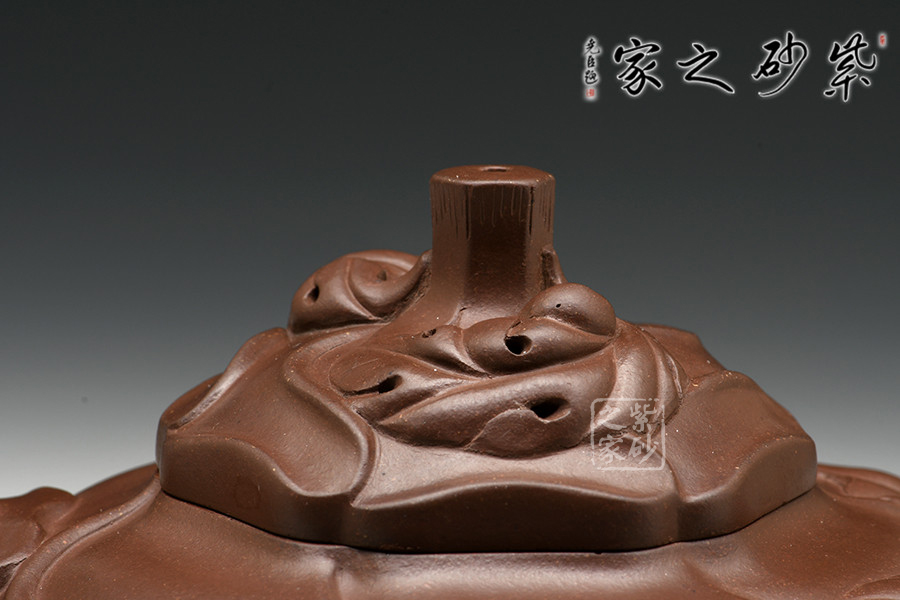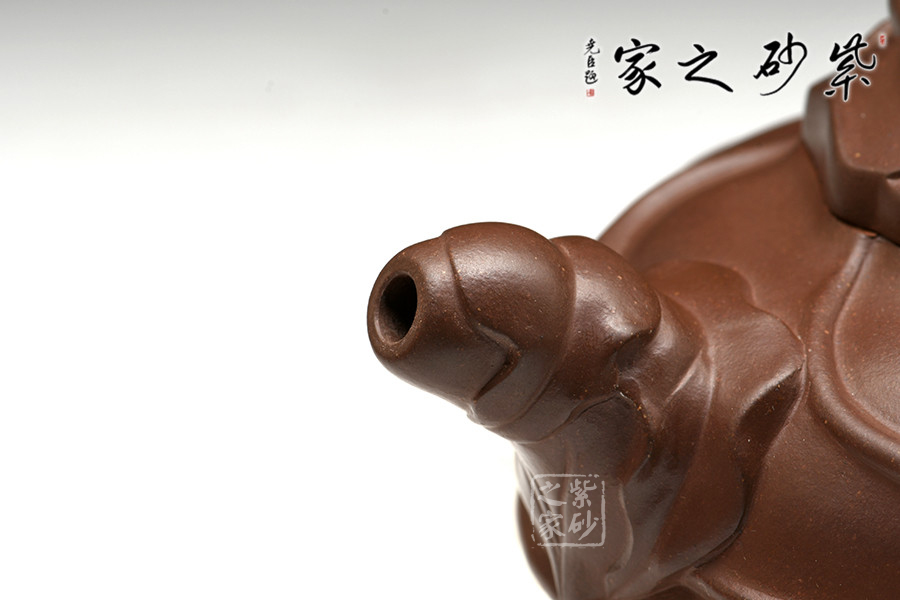 閔璐老師此款風(fēng)卷葵著實(shí)有當(dāng)時(shí)的氣韻,造型以風(fēng)卷錦葵為形,圖案規(guī)則生動(dòng),曲線順和流暢,形態(tài)自然逼真,整體端莊大度,風(fēng)格古樸雅致。流卷葵葉,鈕飾葵干,把以葵莖枝葉扭曲延伸,與壺身、壺蓋所飾筋、紋、葉、莖協(xié)調(diào)和諧,器形手工藝砂味十足,韻味濃厚,展示出自然生動(dòng)、細(xì)膩逼真、生機(jī)勃勃的風(fēng)貌英姿。
