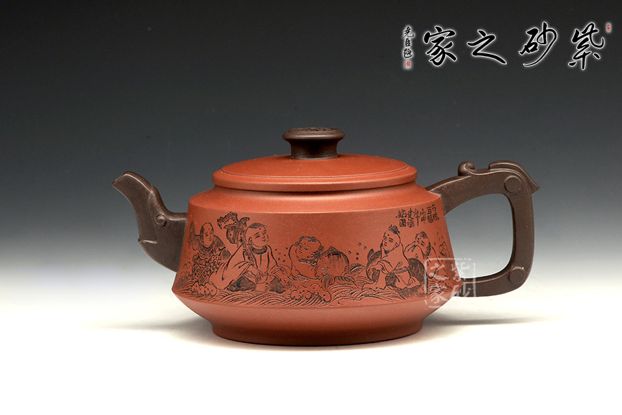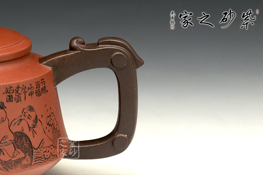 擅于自制自銘,精于雙色泥料制壺,裝飾手法玩裝金銀鑲嵌、堆泥貼花
