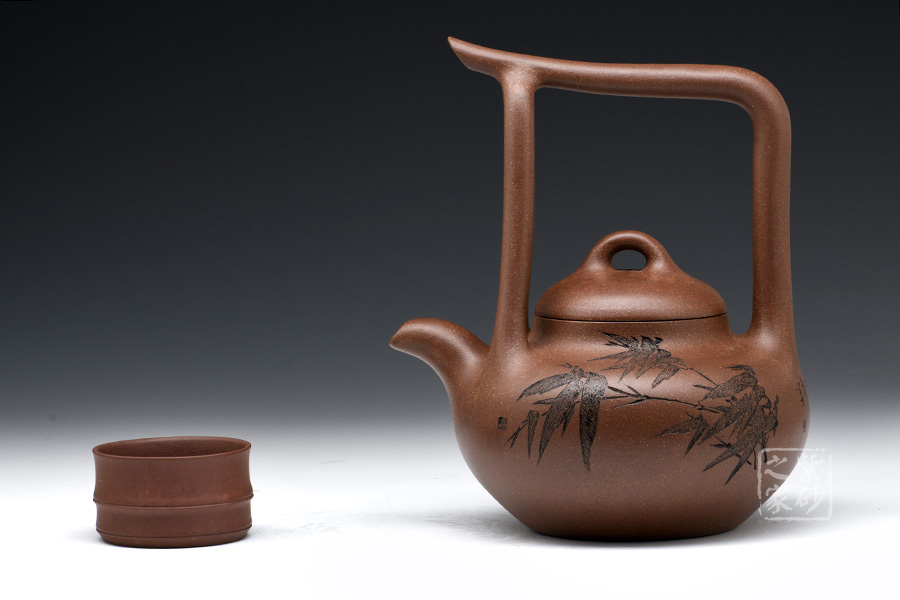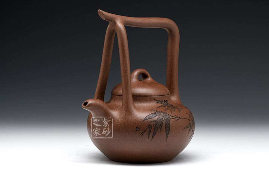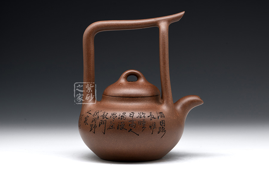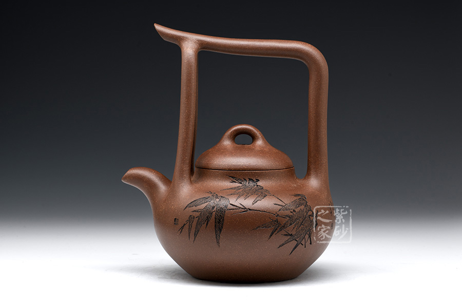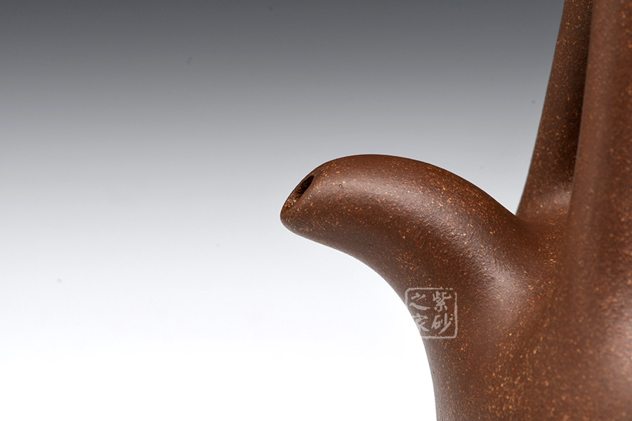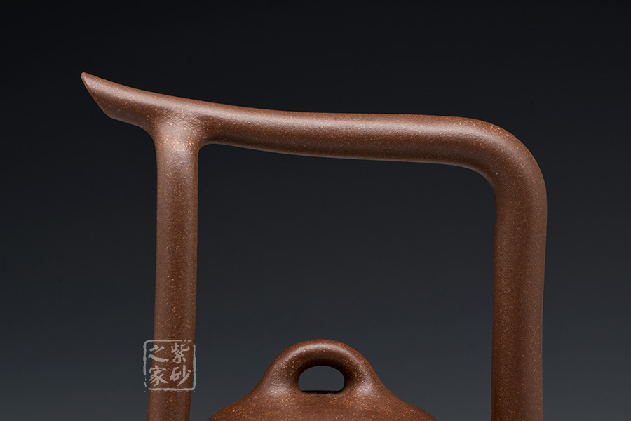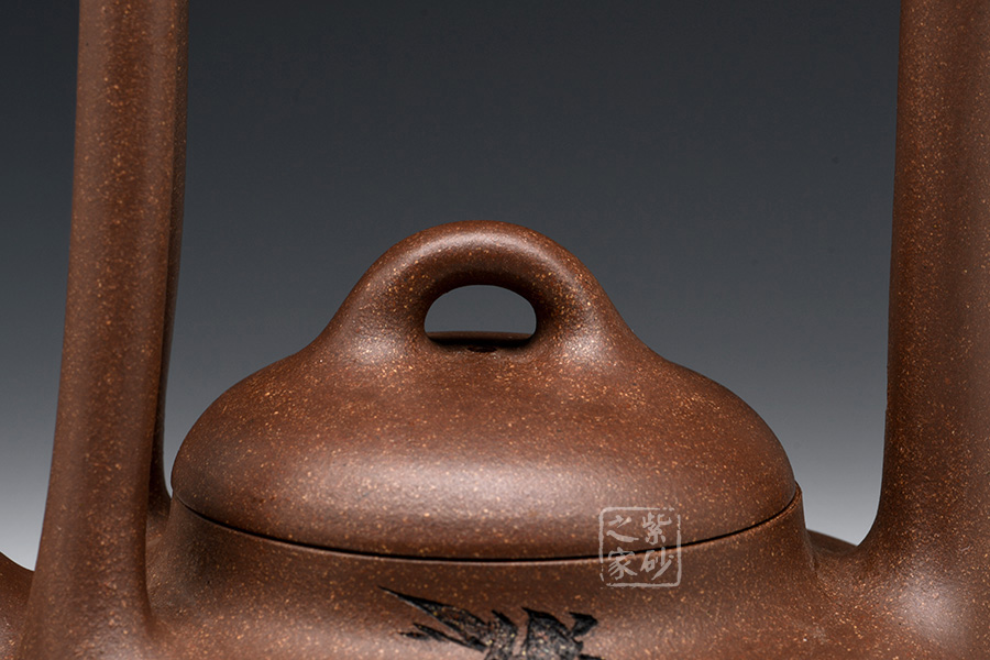 該提梁壺的壺身呈扁圓柱狀,線條流暢自然,柔和中帶有剛健之氣。壺嘴彎流略有上翹,外觀精致大氣。壺鈕為橋型鈕,生動(dòng)形象,活靈活現(xiàn),增添了壺的靈動(dòng)感,妙不可言。提梁設(shè)計(jì),線條流暢明朗,剛勁有力,精致美觀。