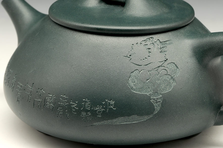 造型簡(jiǎn)練,古樸大方,剛中有勁。流把鈕均為暗接手法,與壺身宛若一體,可見(jiàn)功力。橋鈕搭接在平蓋之上,直流嘴,三角把拐角處略微圓潤(rùn);壺身較為飽滿(mǎn),乳足圓潤(rùn),略見(jiàn)憨態(tài),透露幾分柔美,文人氣息頗濃。