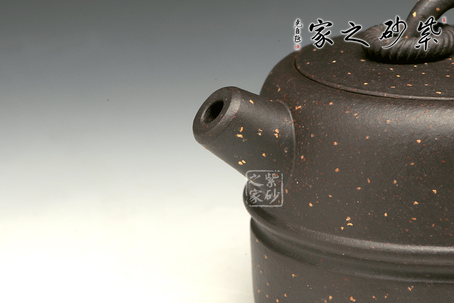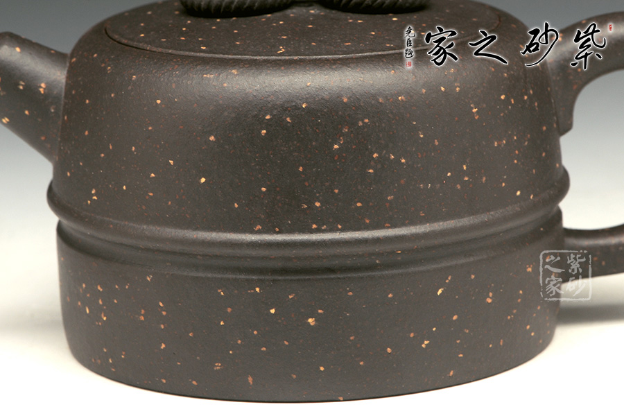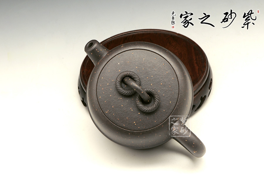 巨輪珠壺為傳統(tǒng)壺型之一,各位藝人經(jīng)過自己的理解往往在細(xì)節(jié)處施以不同變化,整體上而言,壺鈕的巨輪造型與壺身寶珠形狀為其基本特色,顯得玲瓏而精美,為世人所喜愛。壺飽腹,直流挺峭而長,耳形把無飛,扁圓鈕,壺蓋中間鼓起,簡潔大方,口蓋密封性極佳,出水成股,斷水自如,乃是品茗佳品!