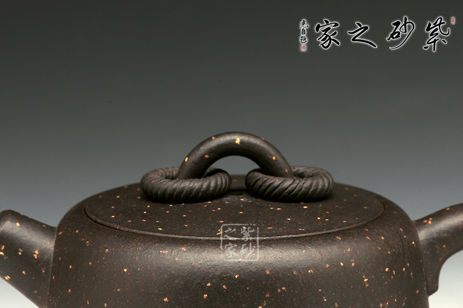 此壺色澤上多了幾分素凈,隱約可見泥料中不同色澤的砂粒,因此壺身散發(fā)著氤氳的光芒,似流光游動。整器圈鈕、短流、嵌蓋、矮身筒、耳把,這些部位的形狀與銜接顯得完美無缺,相得益彰。