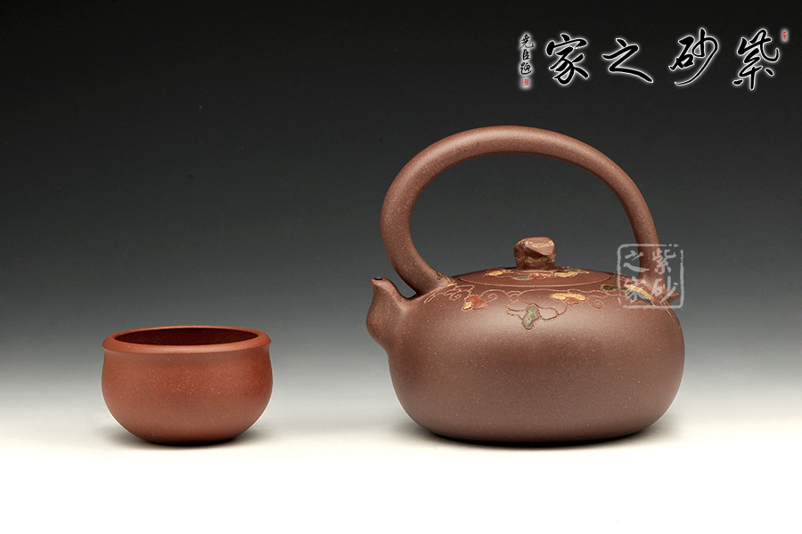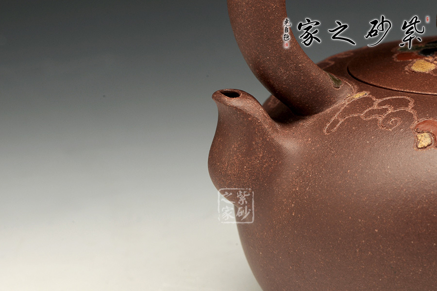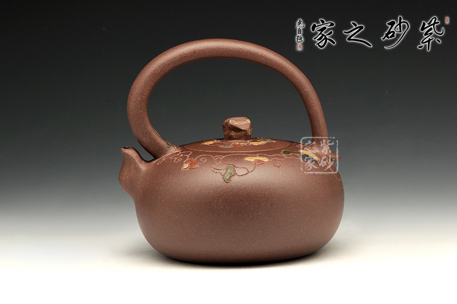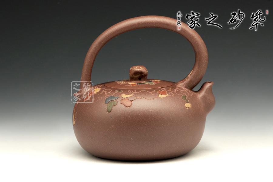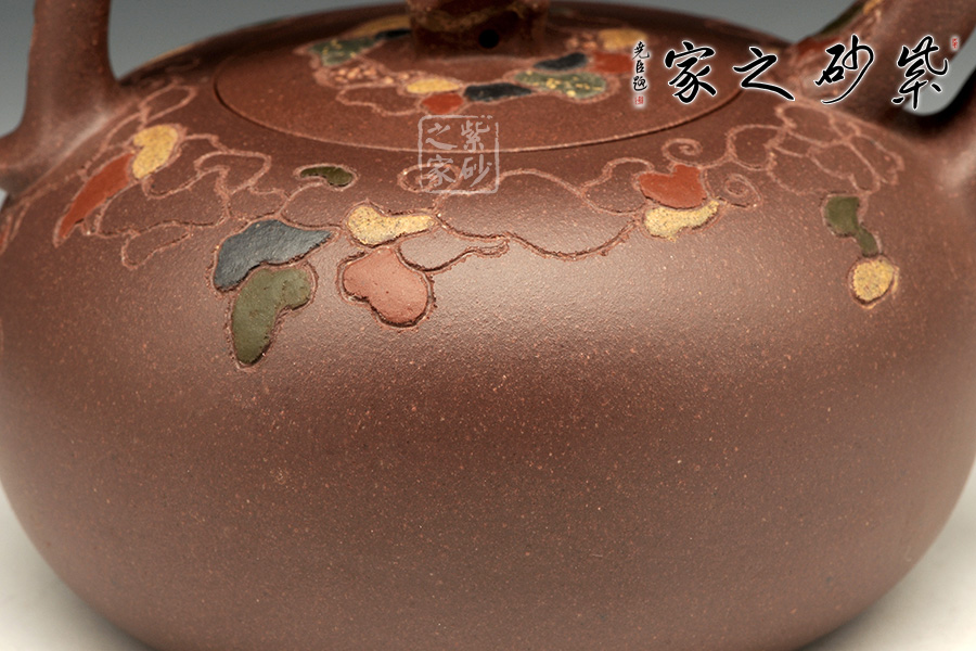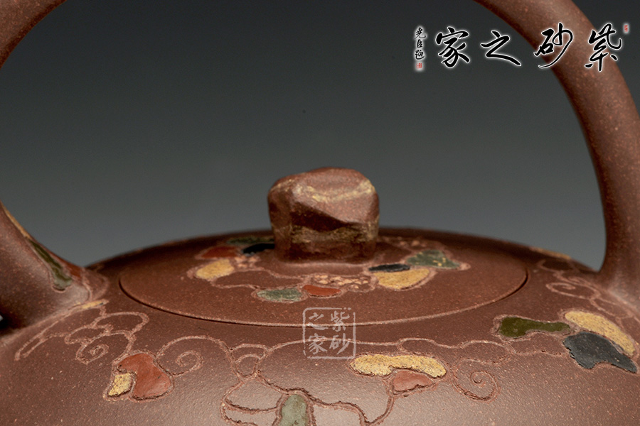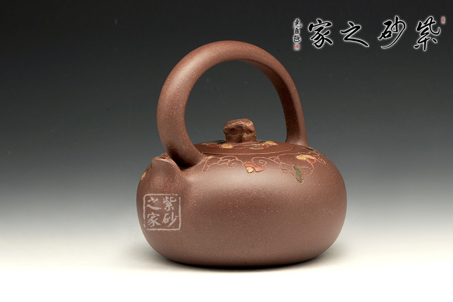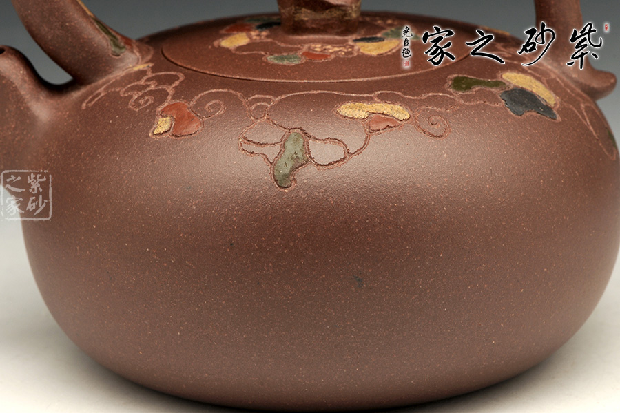 該提梁壺的壺身呈扁圓珠狀,線條流暢自然,柔和中帶有剛健之氣。壺嘴直流略有上翹,外觀精致大氣。壺蓋上面刻繪彩色圖案,生動形象,活靈活現(xiàn),增添了壺的靈動感,妙不可言。提梁設(shè)計,線條流暢明朗,剛勁有力,精致美觀。