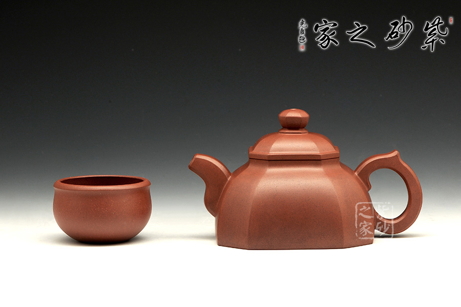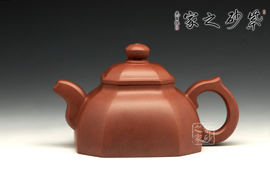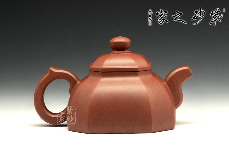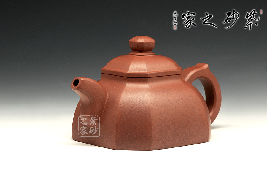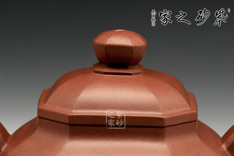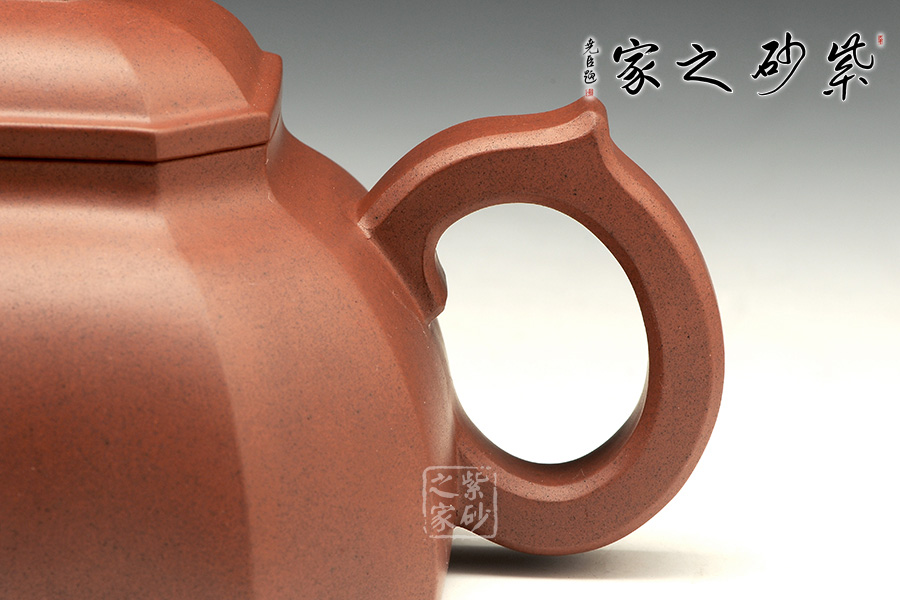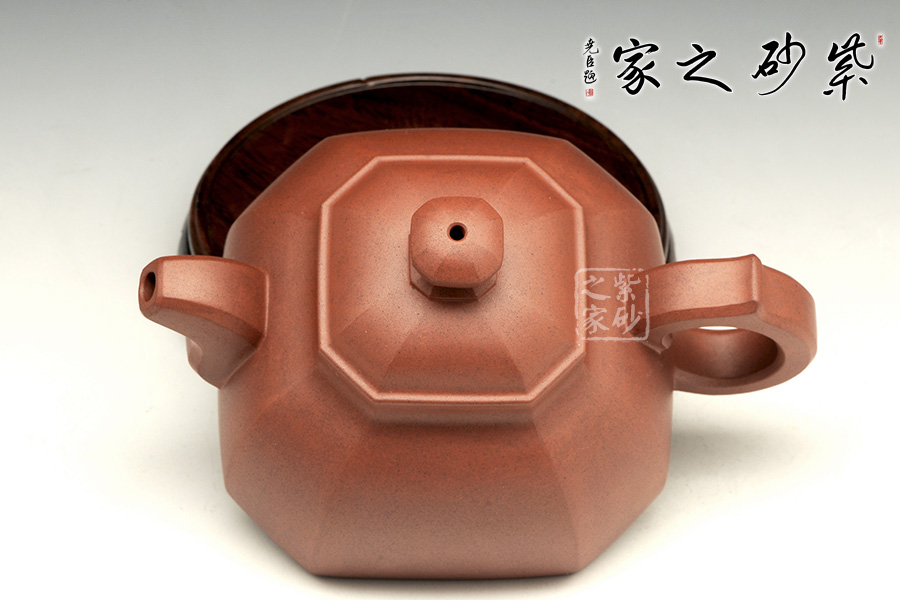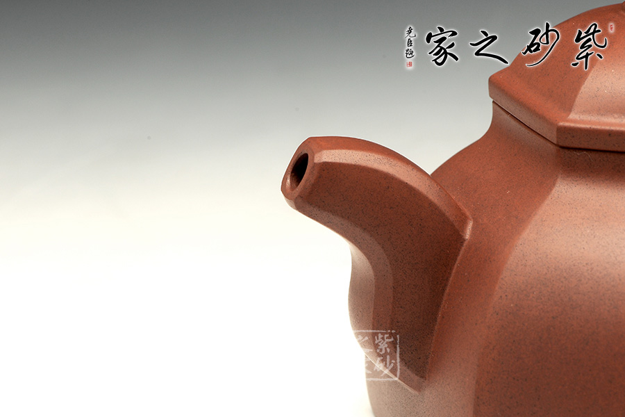 壺身的四方型中融入圓形,四角被切去,圓滑里有工整自然。子母線的圓潤(rùn)非常動(dòng)人,平整細(xì)膩,足見(jiàn)工藝高超。蓋上鼓起,八方珠鈕小巧精致。彎流嘴上下粗細(xì)變化獨(dú)特,弧線的美感十分突出。而壺把則是粗細(xì)一致,端握趁手。