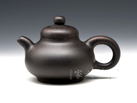 壺身為扁圓球型,線條飽滿,輪廓柔和,如同水中長年累月打磨過的石頭。壺底加圈足,和壺頸部上下對應(yīng),優(yōu)雅氣韻由此頓生。壺蓋飽滿圓潤,如一滴晃動的墨水。蓋上的圓珠壺鈕圓滑可愛,精妙可人。壺把的壺嘴的線條非常明朗,與壺身相比似有些過于清晰,但正是因此,此壺特別的味道才更加濃厚。