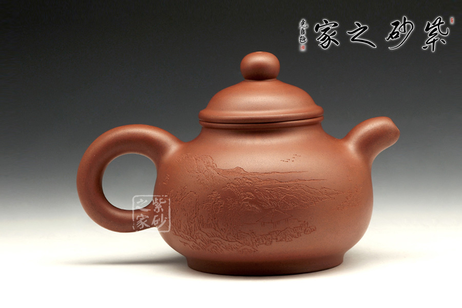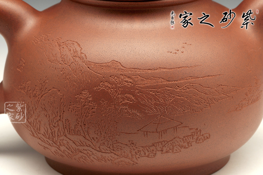 此壺精工細(xì)致,刻繪的景色怡人,讓人把玩欲罷不能。壺身扁圓可愛,輪廓明朗,圈足和壺頸上下對應(yīng),美感頓生。壓蓋的子母線對仗工整,嚴(yán)絲合縫。珠型壺鈕由鼓蓋拱衛(wèi),精巧圓滑,似稀世珍寶。壺嘴和壺把渾圓短粗,氣質(zhì)沉穩(wěn),非常有古典的韻味。通身來看,此壺之精妙寓巧于拙,越是把玩越覺韻味無窮。