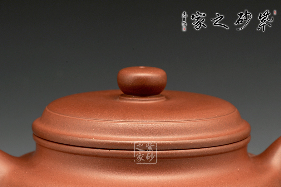 該壺端莊穩(wěn)重、比例協(xié)調(diào)、結(jié)構(gòu)嚴謹。壺身造型取自“盅”型,圓型平紐與器身形似,直流、耳把,有清正直諫君子之風度。壺口上下起圓線,壺肩線條圓轉(zhuǎn),過度極其自然,耳把根部與肩線自然結(jié)合,各自延伸化轉(zhuǎn),呈疏朗大氣之韻。
