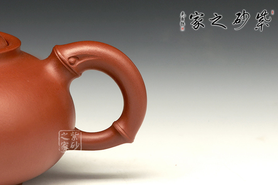 整個(gè)壺體是自然和生活的巧妙融合,壺嘴,壺鈕,壺把均是以一小節(jié)竹節(jié)彎曲而成,尤其是壺鈕,彎曲幅度較大,顯出一種活潑調(diào)皮的韻味。