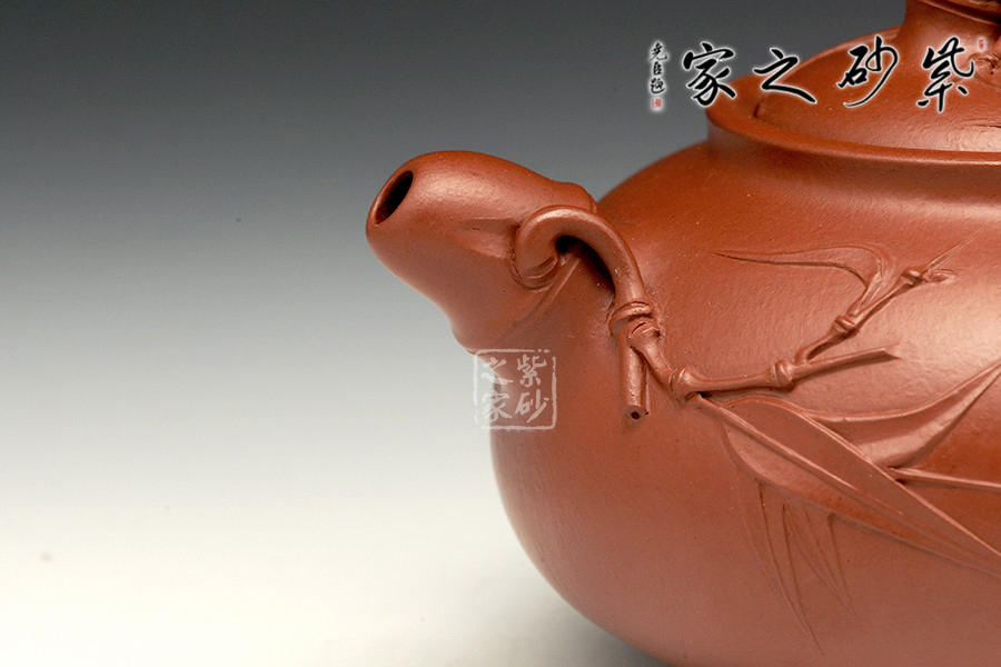 壺嘴竹節(jié)上一直竹枝伸出,幾片竹葉隨風(fēng)招展,覆蓋在壺的表面。整潔光亮的壺身平添了一絲清新逸趣。
