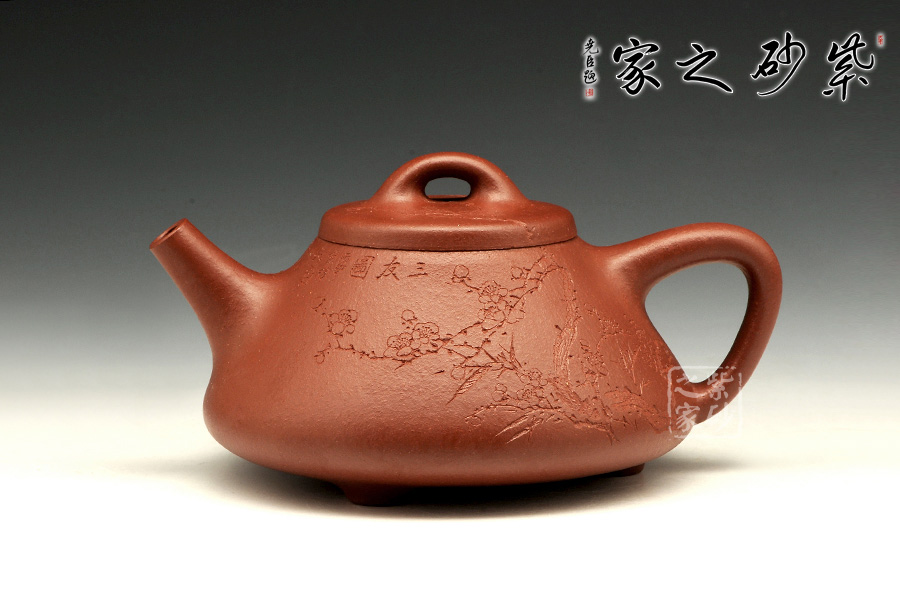 朱泥含鐵量多寡不等,燒成之后變朱砂、朱砂紫或海棠紅等色,熱水沖淋立展嬌嫩鮮紅特色,壺身游移紫光顯現(xiàn),神秘迷人風韻令愛壺之人神醉;有些朱泥含鐵很高,燒成溫度稍高,就會有鐵質(zhì)析出,出現(xiàn)鐵熔點,這樣的泥料顯得格外富有質(zhì)感。