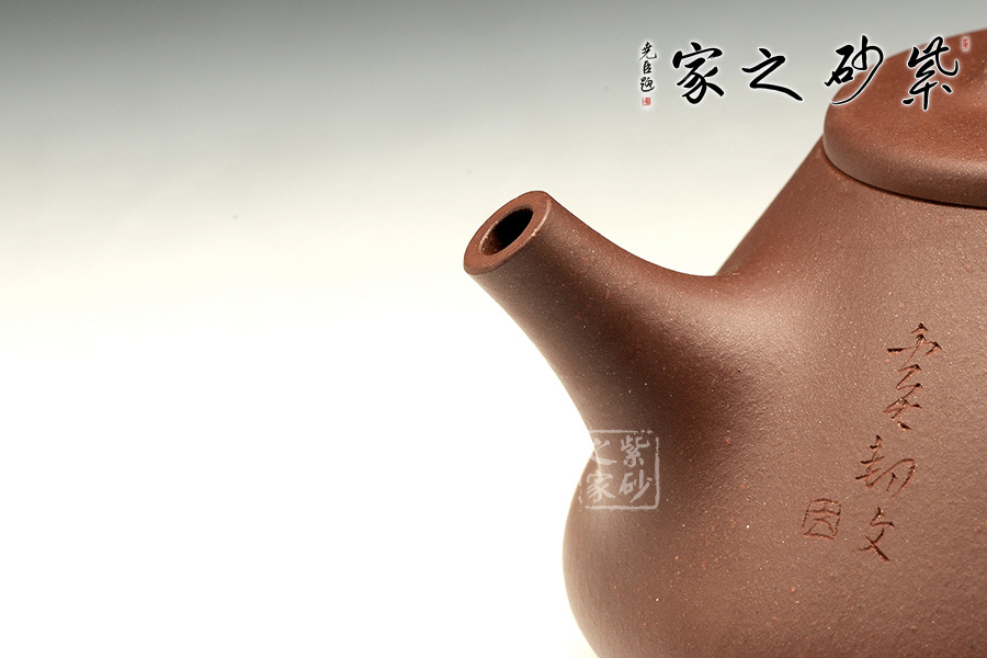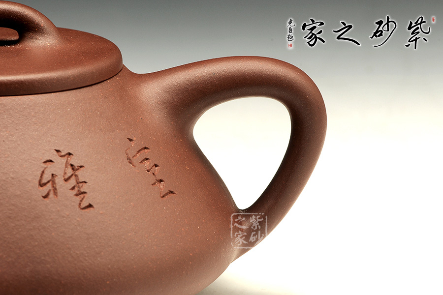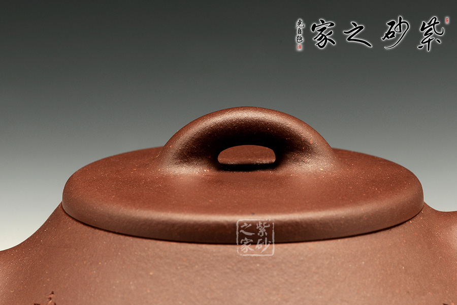 這款原礦底槽青演繹的滿瓢壺,紅而不艷,水色溫潤(rùn),略見透明質(zhì)感。橋鈕搭接在平蓋之上,直流嘴,三角把拐角處略微圓潤(rùn);壺身較為飽滿,乳足圓潤(rùn),略見憨態(tài),透露幾分柔美,文人氣息頗濃。