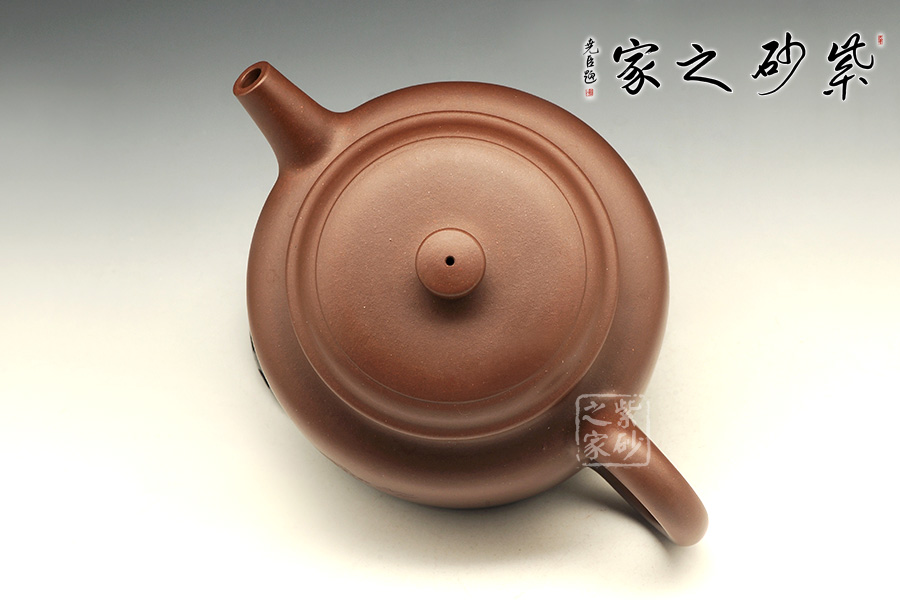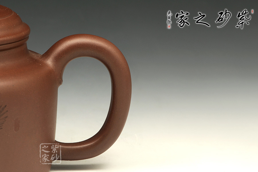 該壺端莊穩(wěn)重、比例協(xié)調(diào)、結(jié)構(gòu)嚴(yán)謹(jǐn)。壺身造型取自“盅”型,圓型平紐與器身形似,直流、耳把,有清正直諫君子之風(fēng)度。壺口上下起圓線,壺肩線條圓轉(zhuǎn),過(guò)度極其自然,耳把根部與肩線自然結(jié)合,各自延伸化轉(zhuǎn),呈疏朗大氣之韻。
