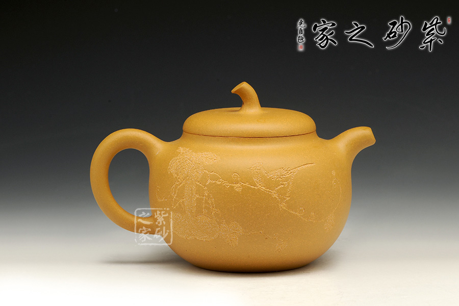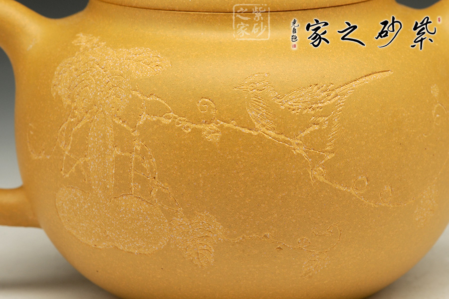 整壺壺身扁圓,拿捏豐碩,壺蓋設計為嵌蓋與壺鈕融為一體,似瓜藤小帽。彎流嘴和耳性壺把如同果實盤根,枝節凹凸有致,自然生動。在壺把與壺身相聯接之處還繪刻了花卉果實圖,平添了一份田園情趣。讓人把玩不已!