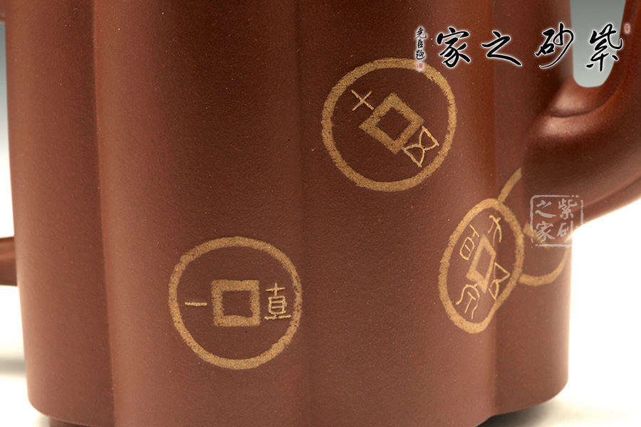 金錢蛤蟆乃常見主題之一,孔春華老師以其獨(dú)特的技法方法制作出此款作品,造型大氣精致,古樸大方,即有圓器的柔和之美,又有筋紋器的精密嚴(yán)謹(jǐn)。在筋紋的壺身之上繪制古幣,難度之大可想而知,且有招財(cái)之意,壺鈕之上一只金蟾敦穩(wěn)地坐在古幣座上,渾身透出一股憨喜之氣,自在安閑間,盡顯富貴與榮耀,金錢蛤蟆可謂送福送財(cái)!
