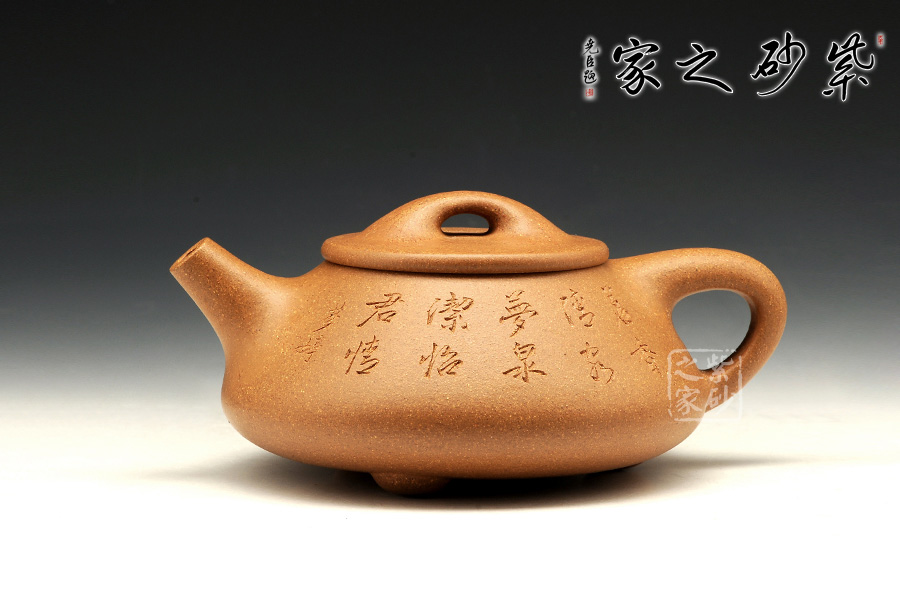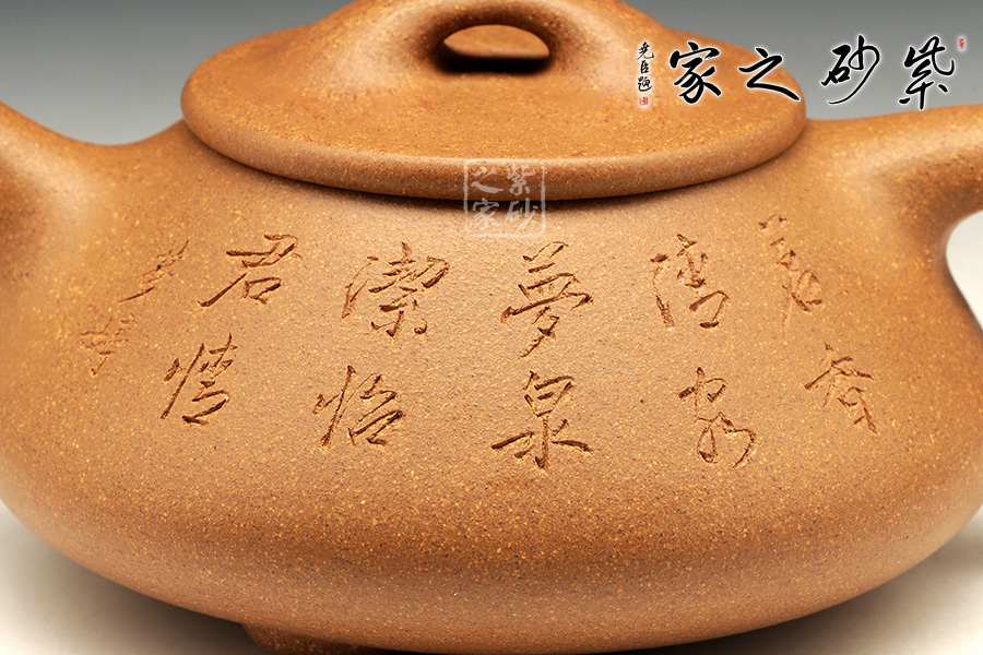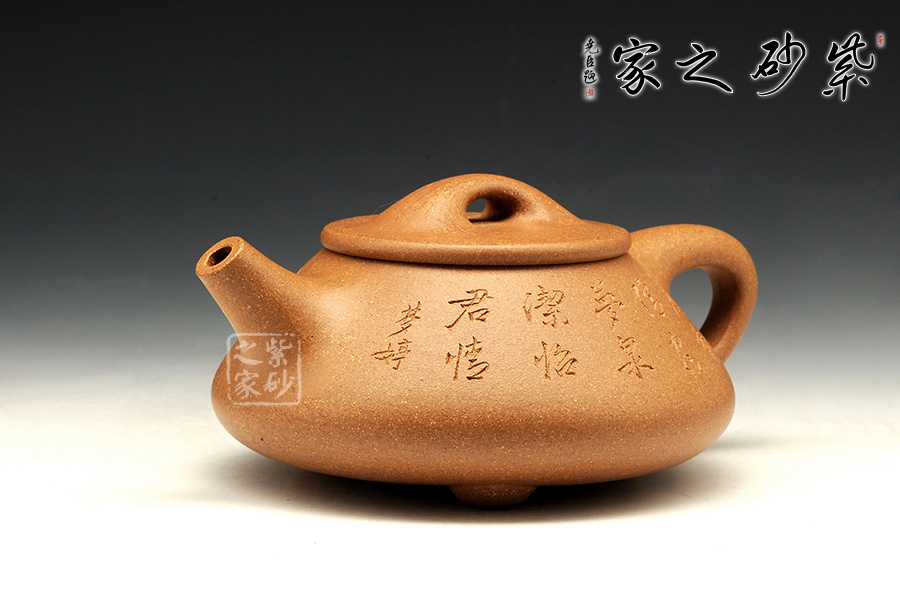 經典的石瓢造型,此壺下大上小呈三角形的石瓢形,周身皆以圓弧線條構成,嘴、把、的處處銜接自然流暢,線條利落明確,起承轉合交待清楚,下以三圓足支起全身,使壺顯得挺括有神,沉靜而深意雋永。暗接直流嘴上翹角度很高出水十分有勁道,三角壺把轉折有力,端握舒適,無處不吐露出渾厚的氣息,更是一種大氣風范。