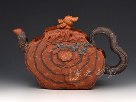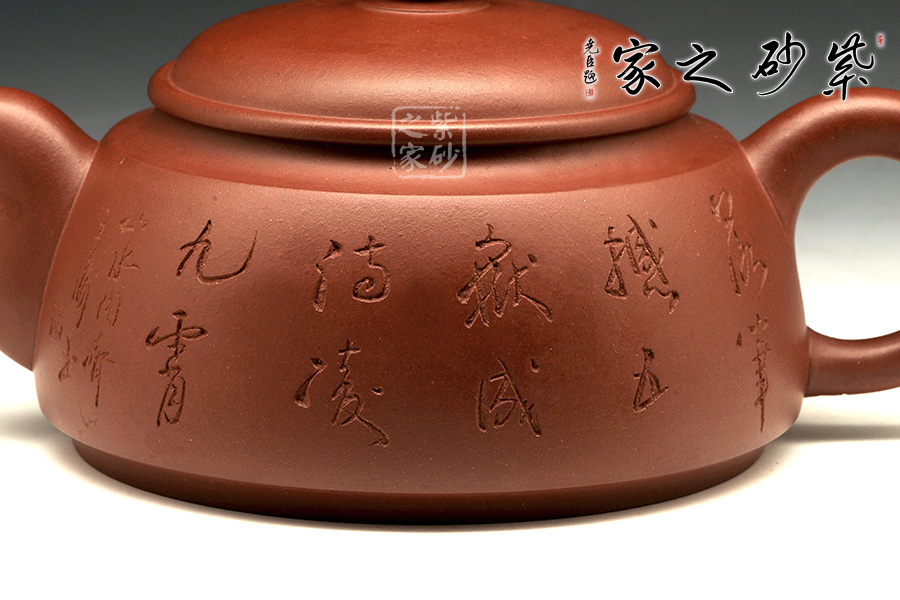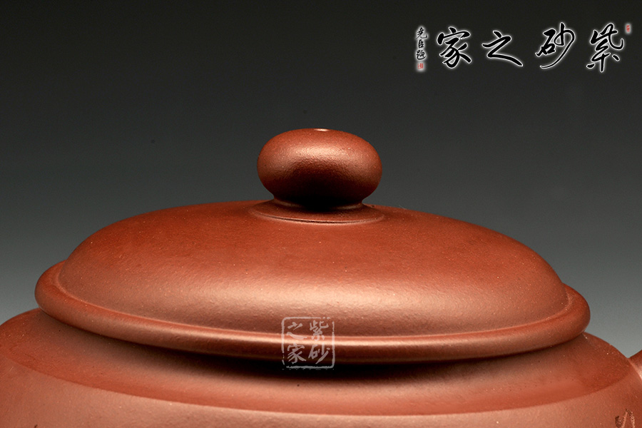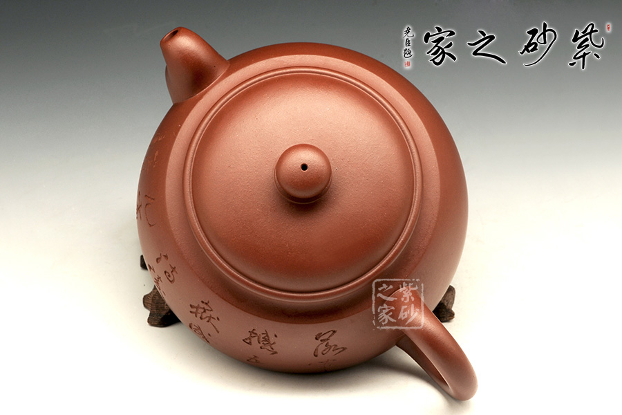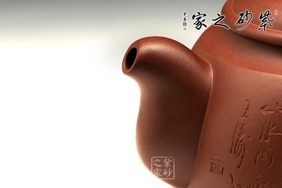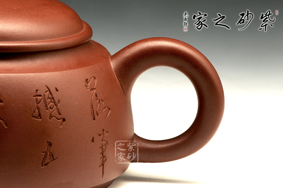 此壺壺身成扁鼓式,圓棱肩,腹部雙折成帶形,壺腹下緣作對(duì)應(yīng)處理,把圓蓄勁,壺嘴將壺肩線與壺嘴、壺把的側(cè)線接連一氣,自然舒暢、整體感強(qiáng),寶珠鈕,嵌蓋圓穹與口唇合體,微細(xì)中見神韻。
