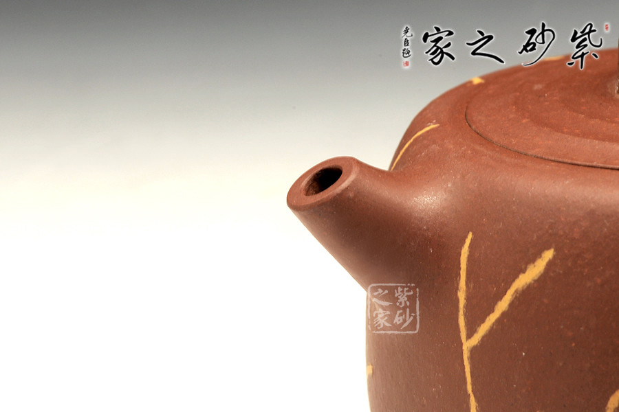 一彎流壺嘴,精巧胥出,嘴口圓潤,出水流暢爽利。嵌蓋設計,與壺身混若一體,天衣無縫,氣密性良好。圓潤的壺嘴和挺立的壺把形成鮮明的對比,壺把中部的突出設計,不僅適于拿握,更具有裝飾性。