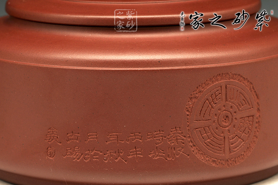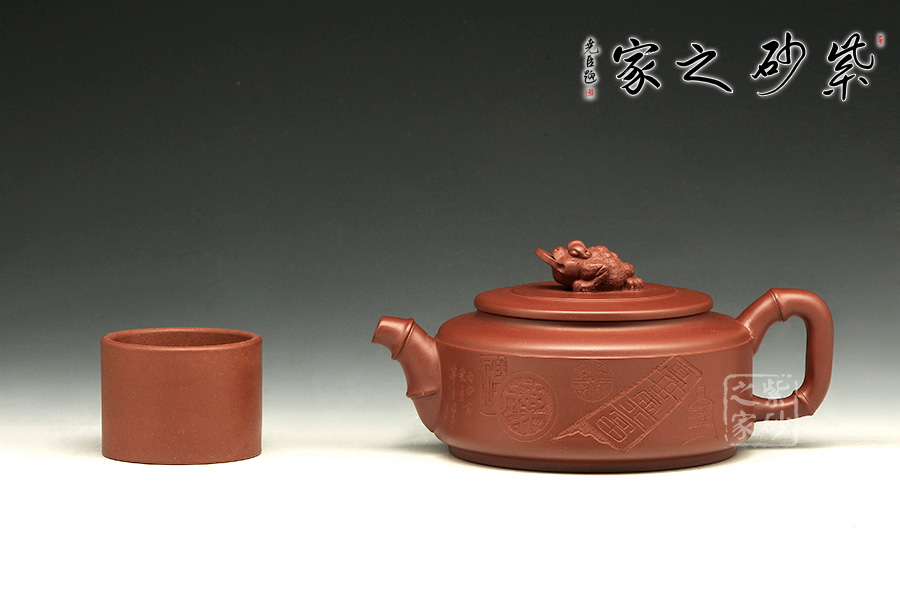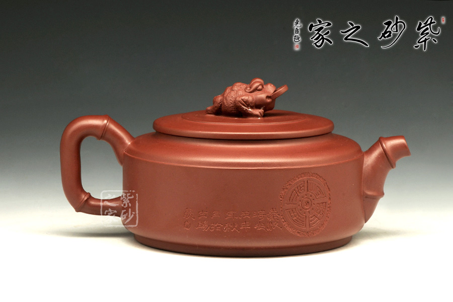 這款作品造型端和經(jīng)典,壺身呈短柱形,壺肩圓潤飽滿,短頸上壓蓋唇線纖柔,壺蓋較為厚實(shí),嚴(yán)絲合縫,氣密性極佳;蓋面上以一只蟾蜍作為壺鈕,寓意吉祥富貴。另外,壺嘴及壺把皆以竹節(jié)為形,造型倒是經(jīng)典大氣,竹節(jié)細(xì)膩蒼勁,清雅怡人,竹同“祝”音;壺身上有銅錢拓片,布滿壺身,是旺財(cái)之意,寓意財(cái)源滾滾。