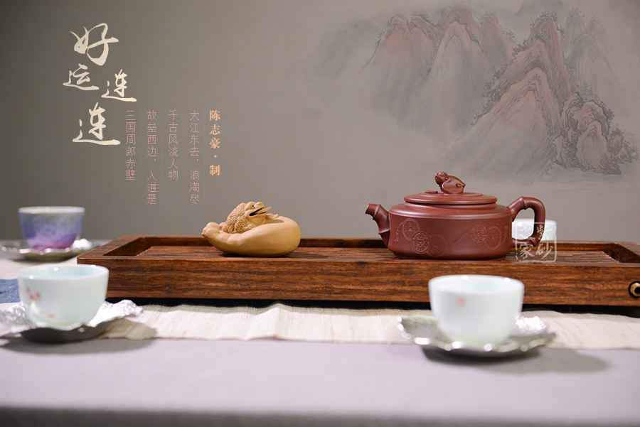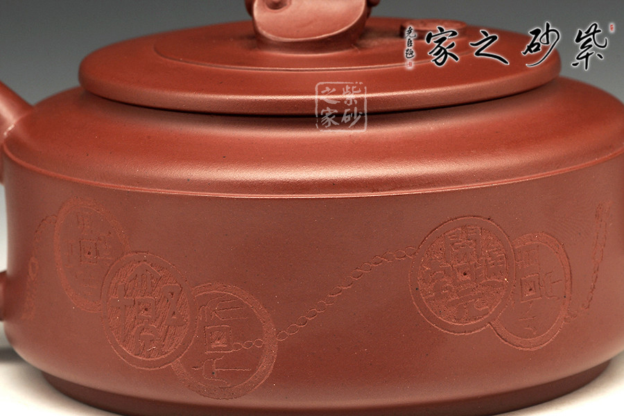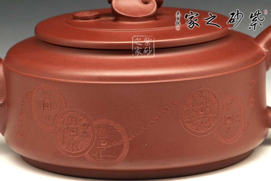 這款作品造型端和經(jīng)典,壺身呈短柱形,壺肩圓潤飽滿,短頸上壓蓋唇線纖柔,壺蓋較為厚實(shí),嚴(yán)絲合縫,氣密性極佳;蓋面上以一只蟾蜍作為壺鈕,寓意吉祥富貴。另外,壺嘴及壺把皆以竹節(jié)為形,造型倒是經(jīng)典大氣,竹節(jié)細(xì)膩蒼勁,清雅怡人,竹同“祝”音;壺身上有銅錢拓片,布滿壺身,是旺財(cái)之意,寓意財(cái)源滾滾。
