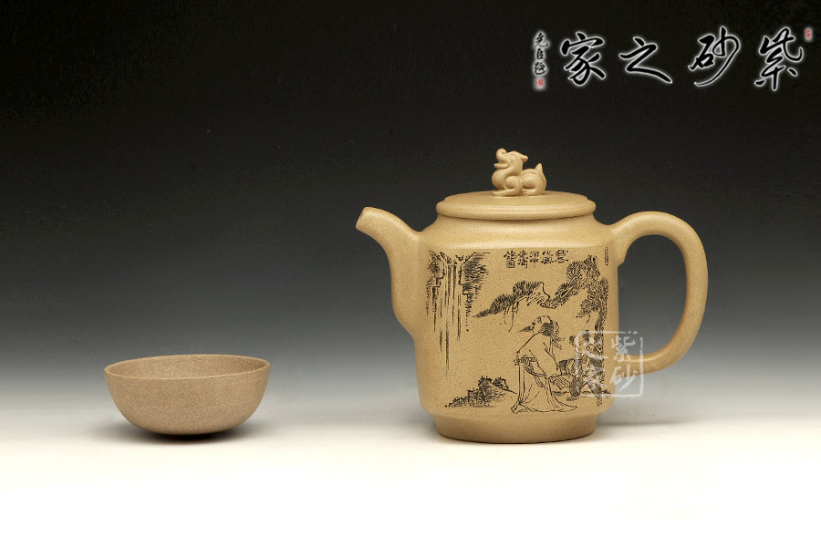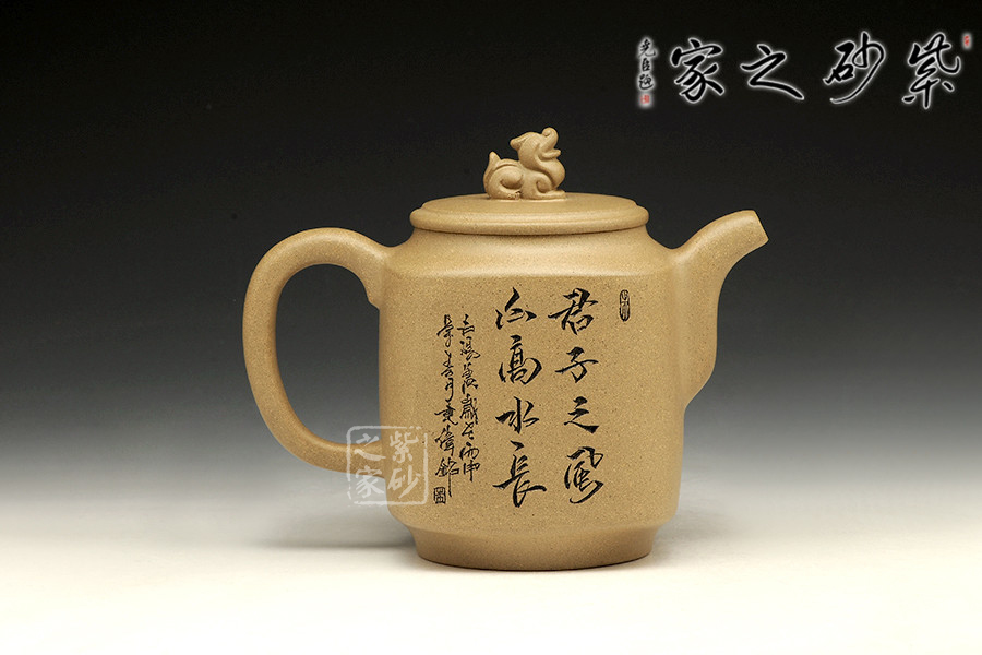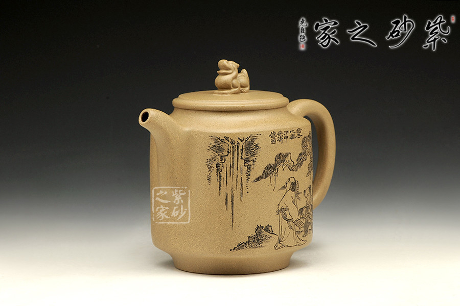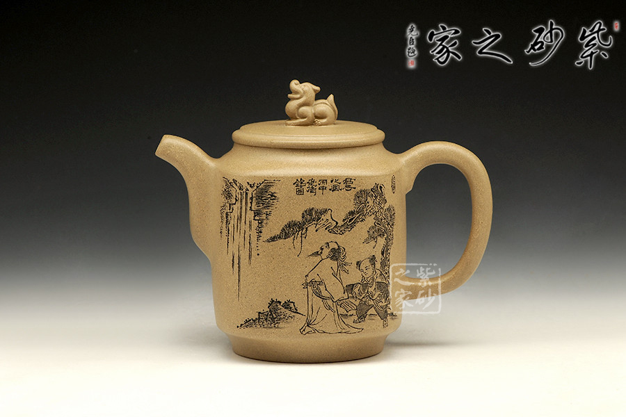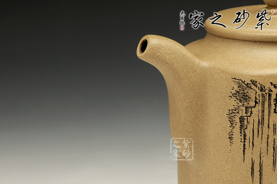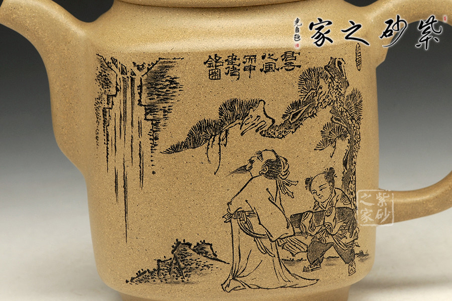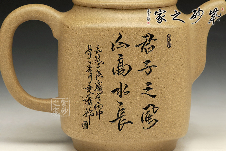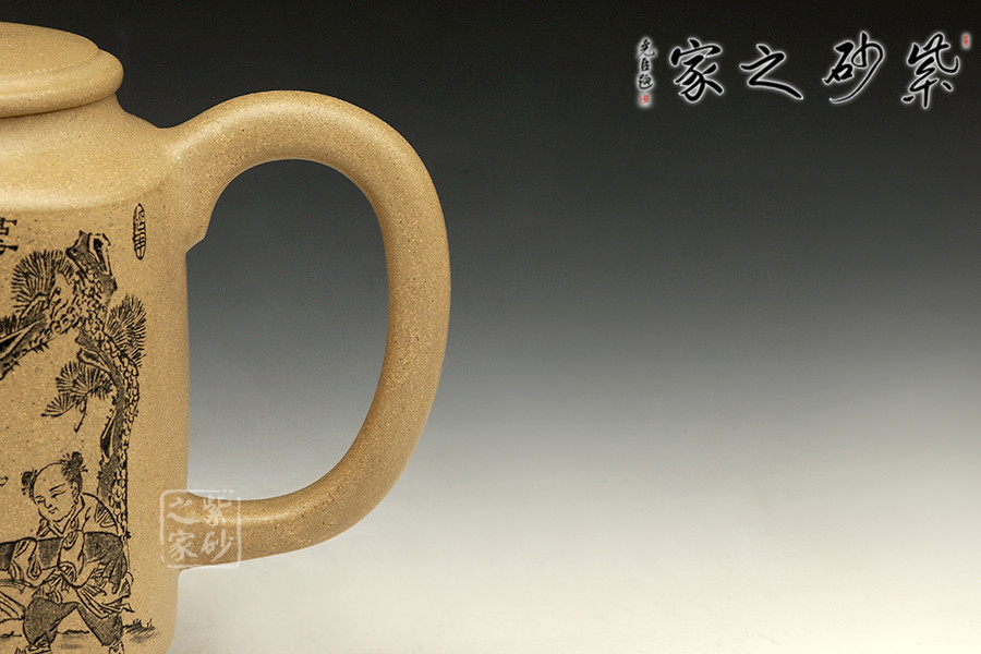 此款作品為朱萍萍老師全手工制作,壺身雙面刻繪,壺身正面刻繪,人物栩栩如生,刻繪極其細膩,線條處理十分到位;壺身反面篆刻“君子之風,山高水長”字跡灑脫,風骨畢露,老師以刀為筆,獨具風格;此款作品,氣質(zhì)敦厚,穩(wěn)重,360CC適合三四人品茗小聚,收藏升值。