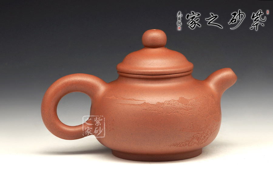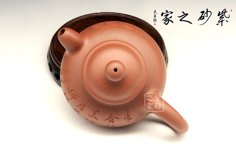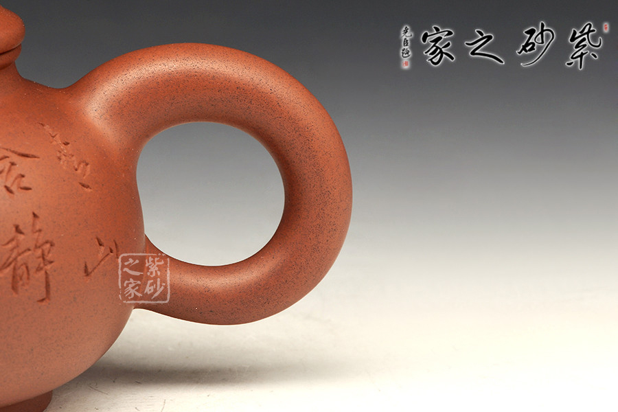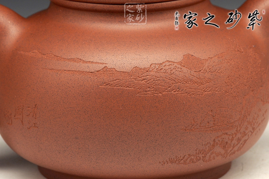 此壺精工細(xì)致,刻繪的景色怡人,讓人把玩欲罷不能。壺身扁圓可愛,輪廓明朗,圈足和壺頸上下對應(yīng),美感頓生。壓蓋的子母線對仗工整,嚴(yán)絲合縫。珠型壺鈕由鼓蓋拱衛(wèi),精巧圓滑,似稀世珍寶。壺嘴和壺把渾圓短粗,氣質(zhì)沉穩(wěn),非常有古典的韻味。通身來看,此壺之精妙寓巧于拙,越是把玩越覺韻味無窮。