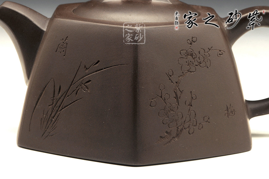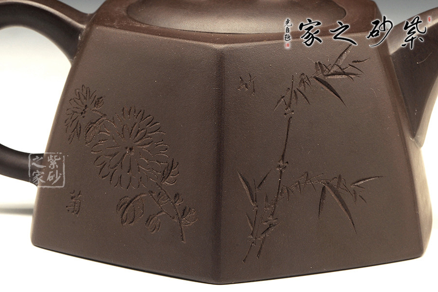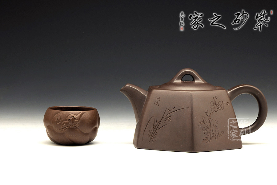 此六方井欄造型新奇,簡(jiǎn)單大方,尤為體現(xiàn)制壺功力。壺身上小下大,六方造型一絲不茍,工整精細(xì),足見(jiàn)制作難度和用心程度。壺肩至壺蓋部分過(guò)度平滑,六邊形線條同心環(huán)繞,層次感十足。橋型壺鈕制作精巧,非常可愛(ài)。壺把和壺嘴用六方制作,但方中有圓,工整且不失圓滑美妙。通身來(lái)觀之,此壺大方得體,氣度不凡,是玩壺的佳作。再配以四杯,“梅、蘭、竹、菊”展四君子之風(fēng)。