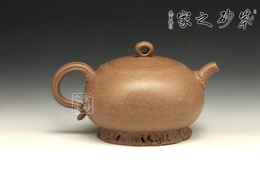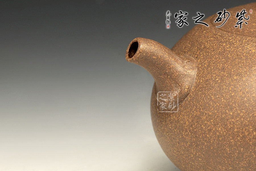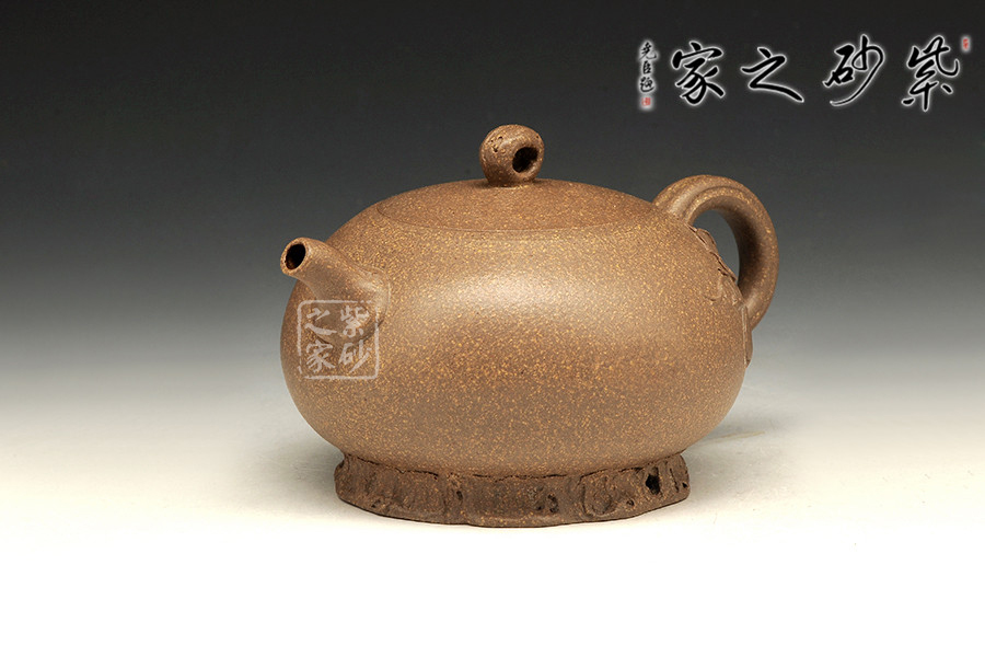 此壺端莊古樸,做工精美,著實是難得的佳作。壺身扁圓可愛,線條飽滿豐盈,似毛筆上一滴厚重的墨汁。壺底加圈足,與壺頸上下對應(yīng)。子母蓋對仗平整,鼓蓋略平滑,圓珠壺鈕小巧而精致。壺嘴和壺把線條濃重,一多一少相互對應(yīng)。整個壺型看起來藏巧于拙,把玩起來趣味無窮。