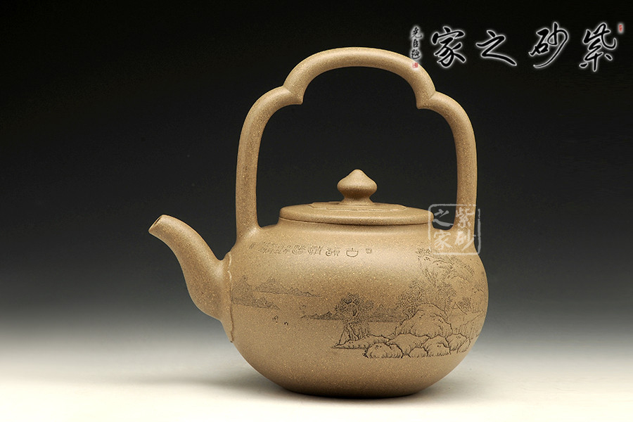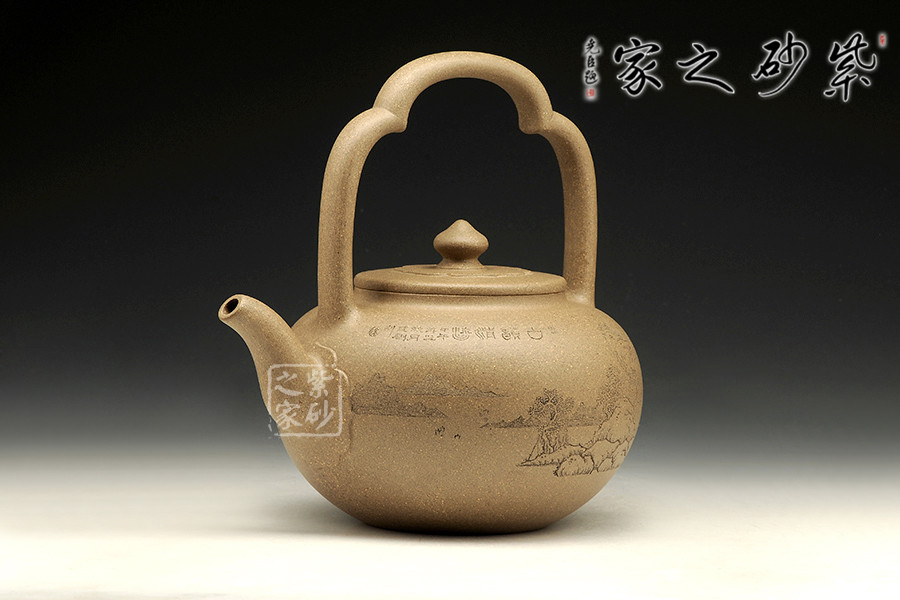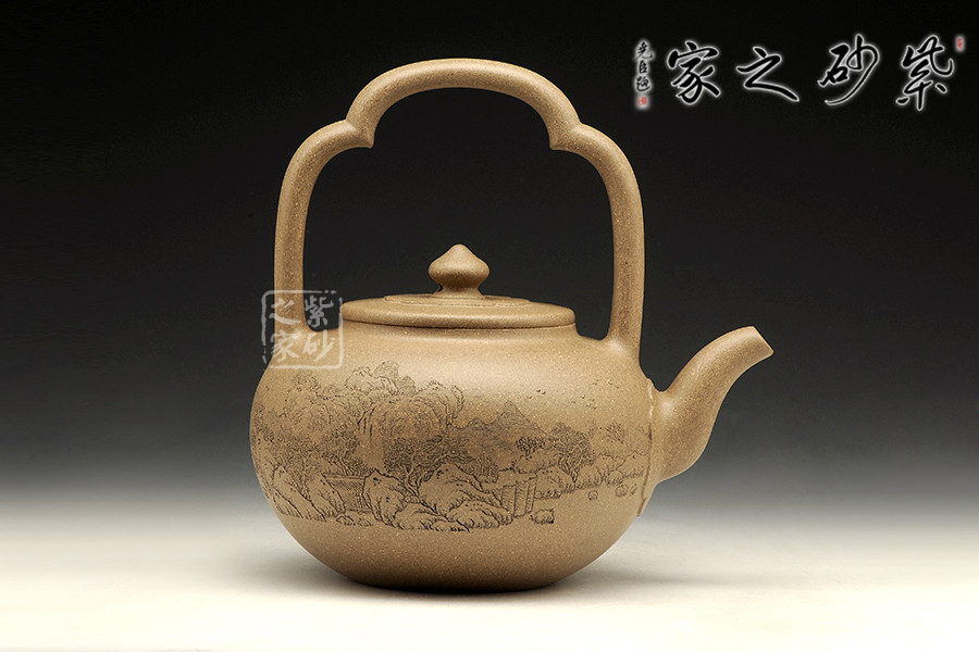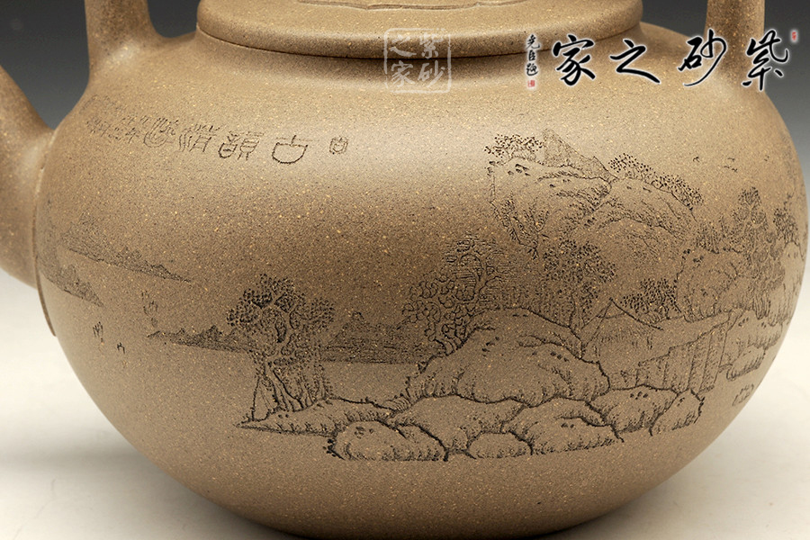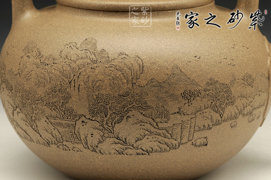此壺壺身通身泥繪山水畫卷,技法高超,精湛無比