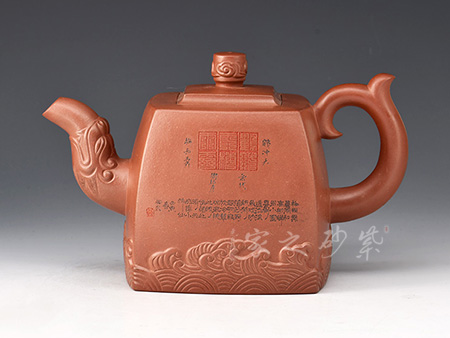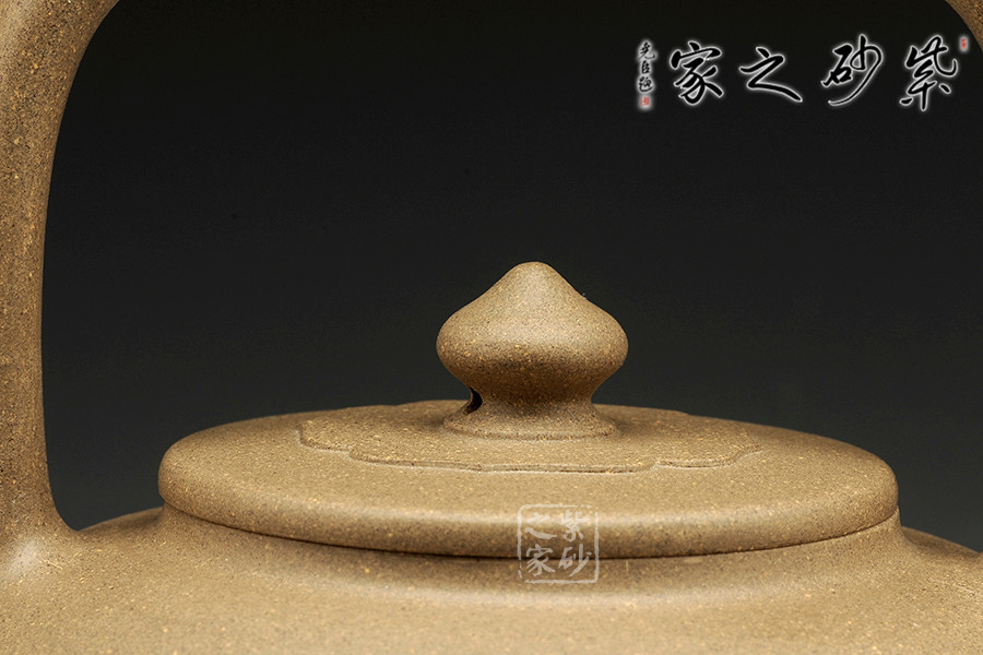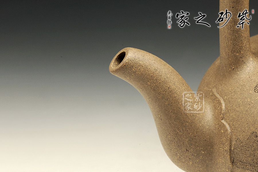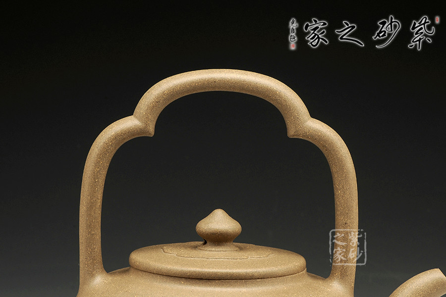 提梁壺是紫砂壺中的經(jīng)典款型之一,此提梁壺則是別具一格。此壺飽滿鼓起如大仙桃,色澤光亮誘人,壺鈕造型精致唯美,仿若如意和仙桃的結(jié)合,可愛美觀,并寄寓了滿滿的吉祥和祝福,且拿捏適手。瘦長(zhǎng)壺嘴自然上揚(yáng),呈二彎流狀明接于壺身,明接處散開如荷葉,甚是好看。提梁猶若古時(shí)梁欄,生動(dòng)形象,不禁讓人暢想一個(gè)個(gè)發(fā)生在古代庭梁之下的優(yōu)美感人故事。此壺,值得珍藏和玩味。