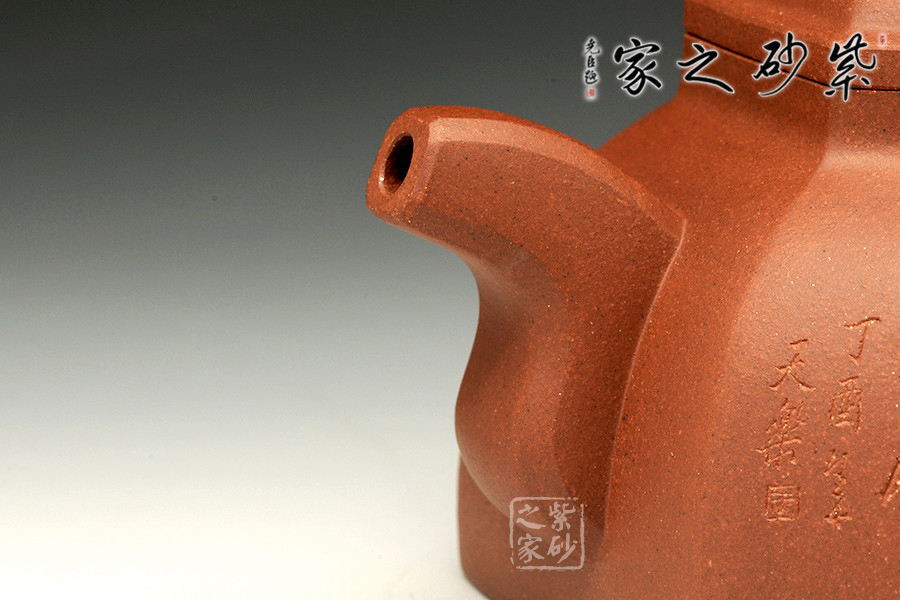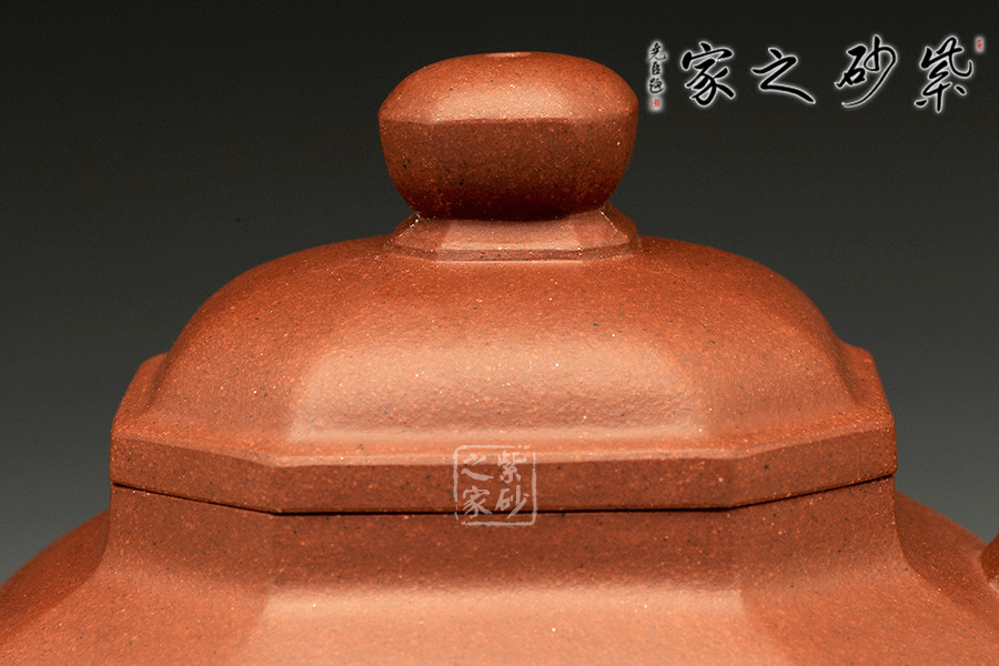 壺身的四方型中融入圓形,四角被切去,圓滑里有工整自然。子母線的圓潤非常動(dòng)人,平整細(xì)膩,足見工藝高超。蓋上鼓起,八方珠鈕小巧精致。彎流嘴上下粗細(xì)變化獨(dú)特,弧線的美感十分突出。而壺把則是粗細(xì)一致,端握趁手。
