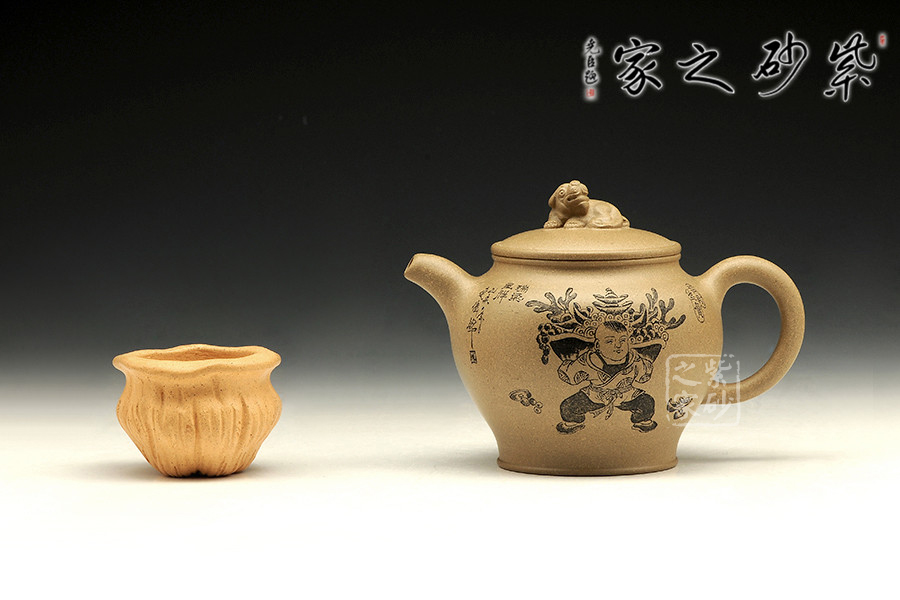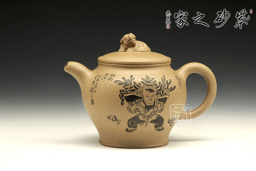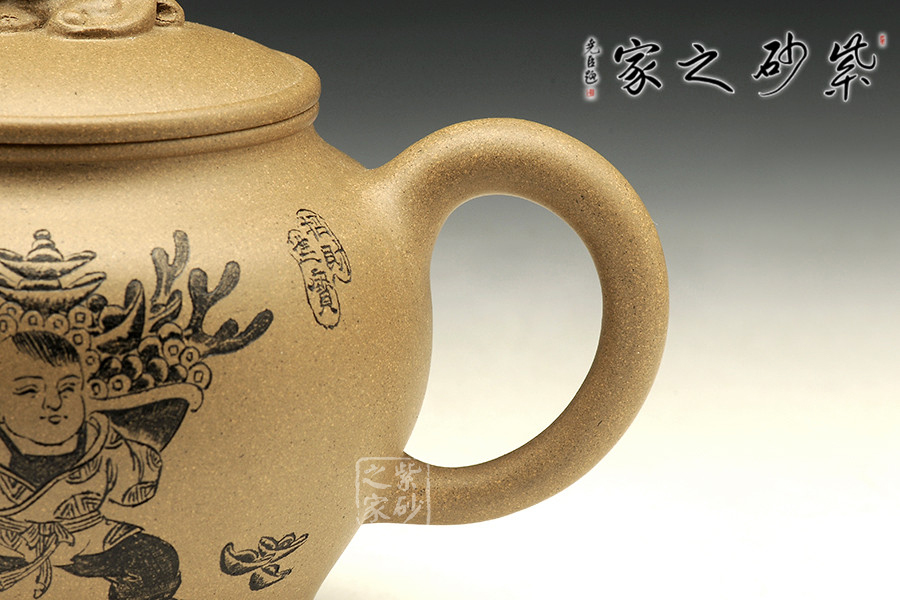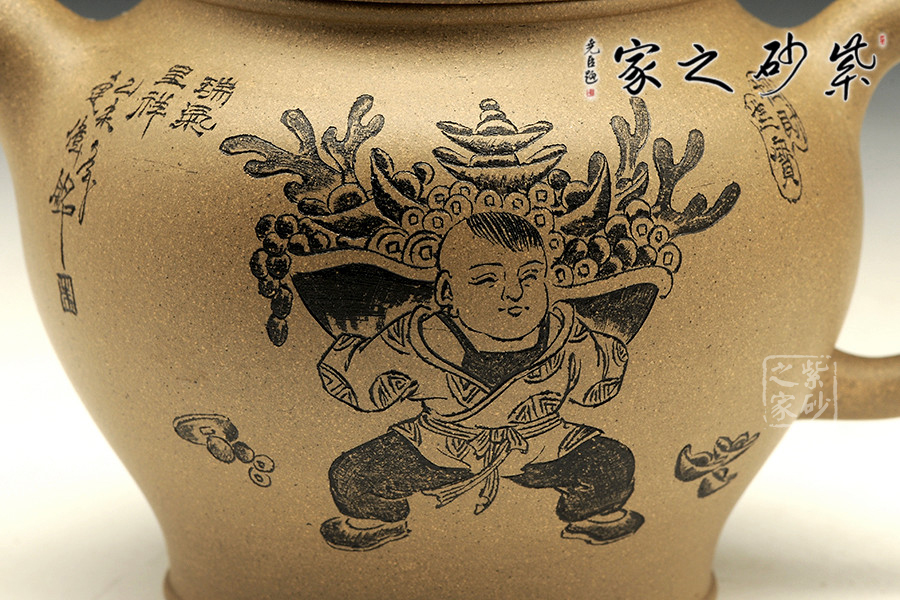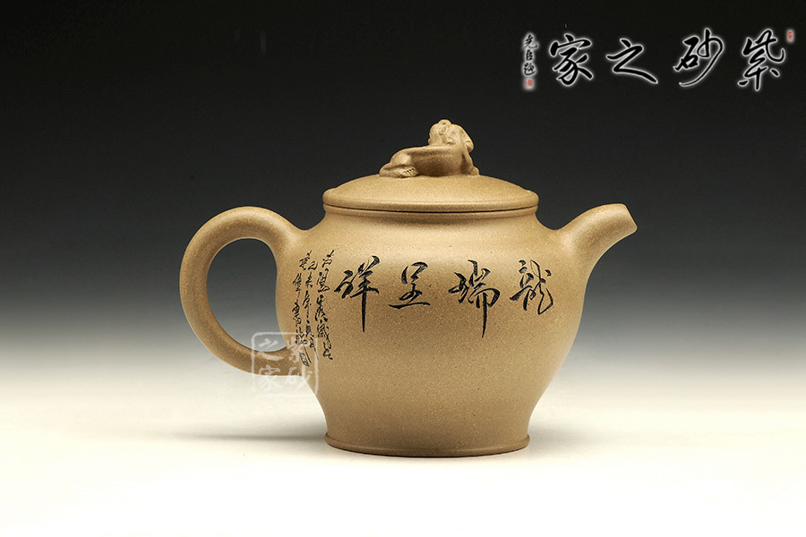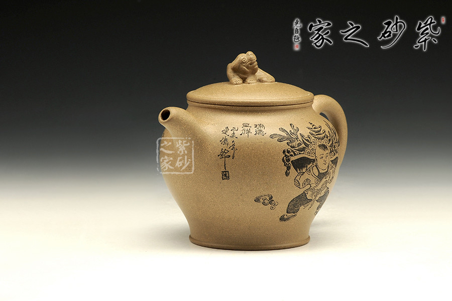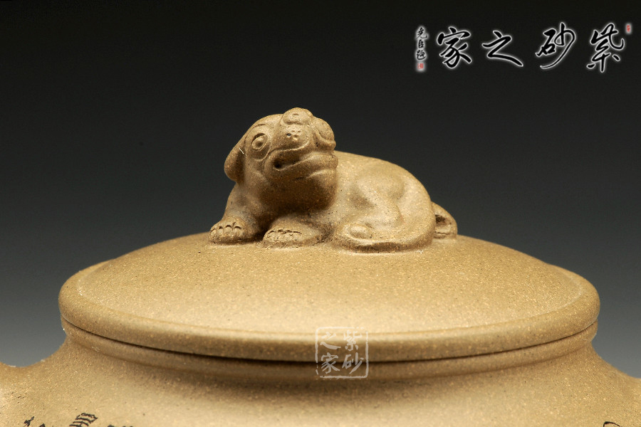 此壺造型簡練,古意悠然,祥瑞之氣卻因龍鳳而生,讓人心生喜歡。壺嘴彎卻出水利落,壺把從壺肩胥出,歸于壺底,似金鐵質地般有力。壺鈕是一只瑞獸,尤為讓人稱道的,是壺身上的刻繪。