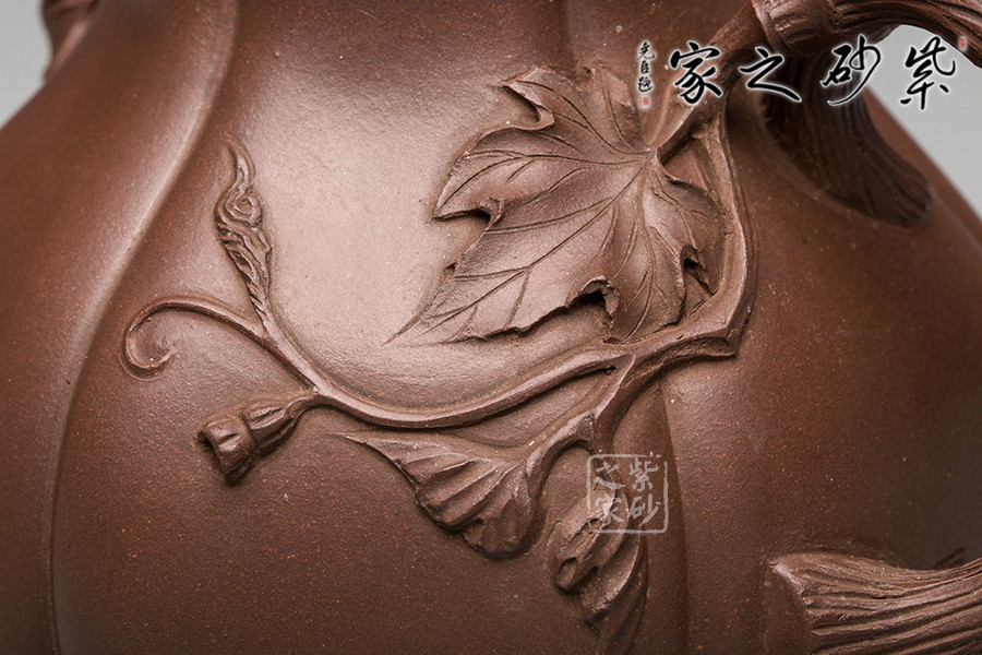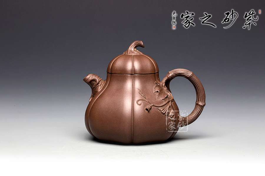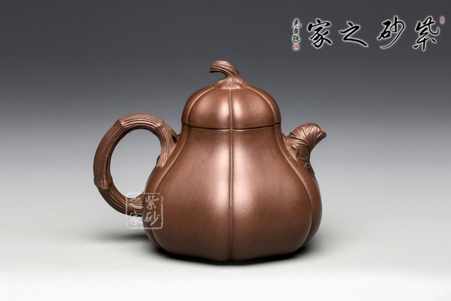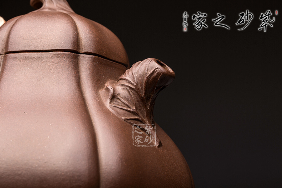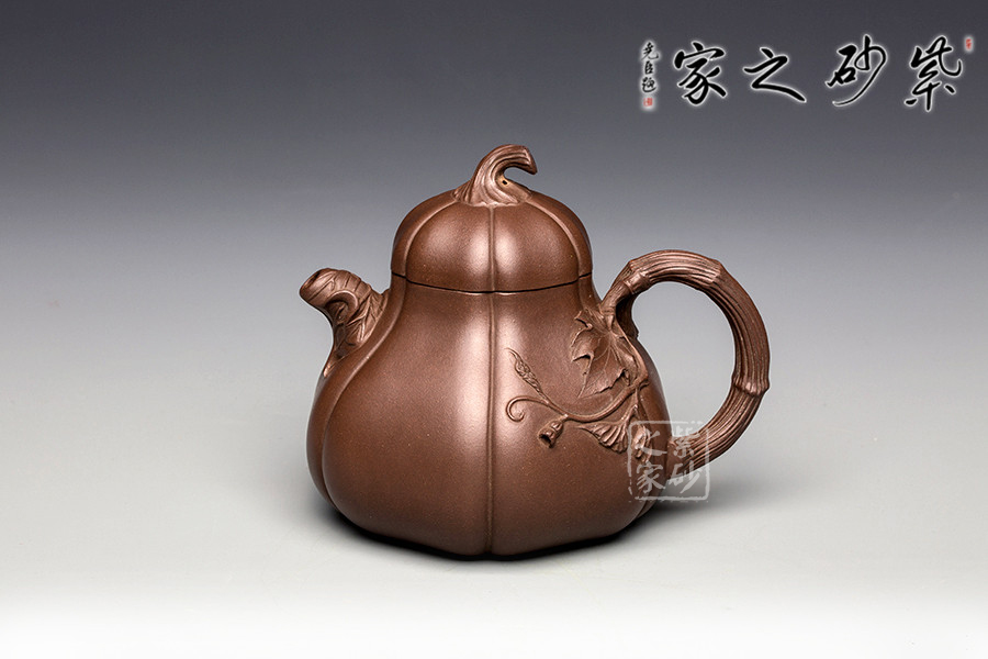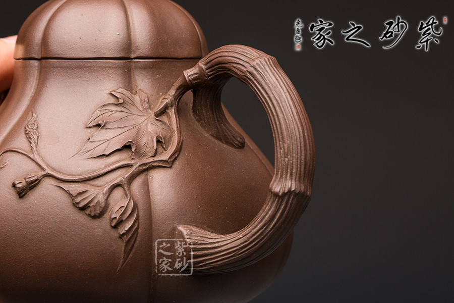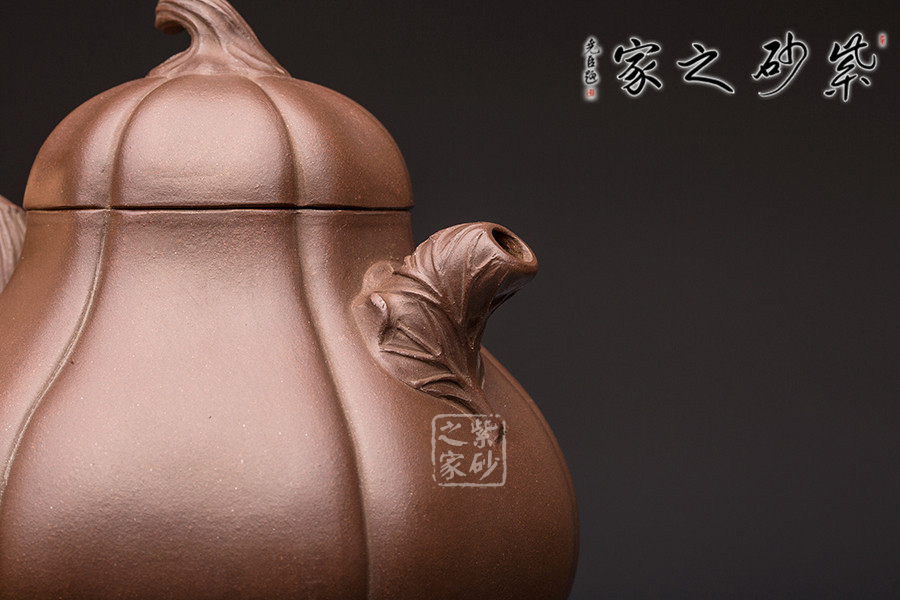 這把南瓜壺以瓜形為壺體,瓜柄為壺蓋,瓜藤為壺把,葉脈藤紋,貼繪逼真,構(gòu)思和諧巧妙,取材自然,雅而不俗。此壺整體色澤古樸,虛實相間。形態(tài)逼真,饒有趣味。壺身圓融作筋紋狀,取南瓜之型。為六瓣依次圓弧起伏,別有韻味。