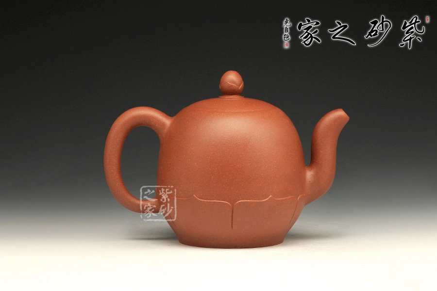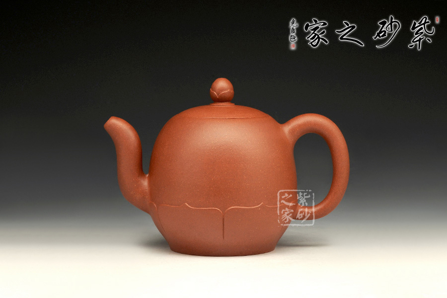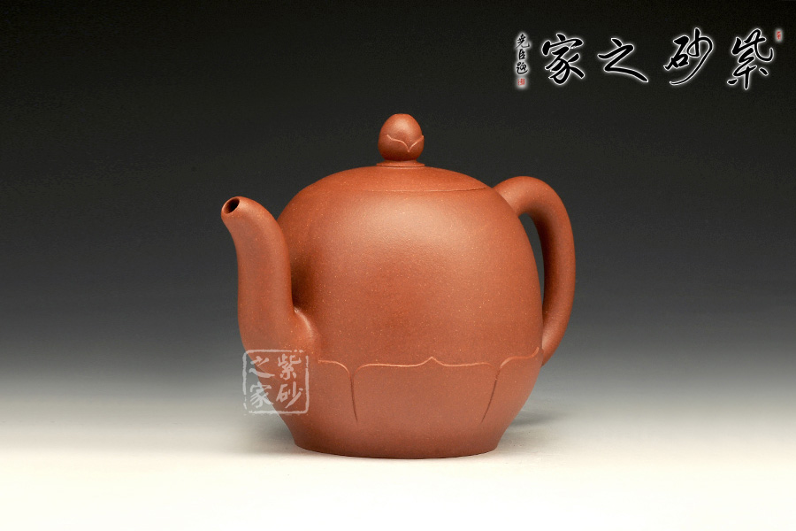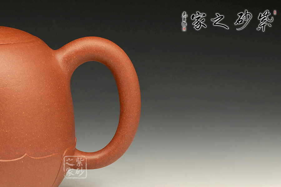 壺身底部穩(wěn)重踏實(shí),上部線(xiàn)條圓潤(rùn),細(xì)膩精致。環(huán)繞壺底一圈有筋紋裝飾,就像是一朵盛開(kāi)的蓮花。壺鈕為一顆花苞,精妙小巧,動(dòng)人異常。彎流壺嘴、壺把則是莖把造型,細(xì)長(zhǎng)曼妙。