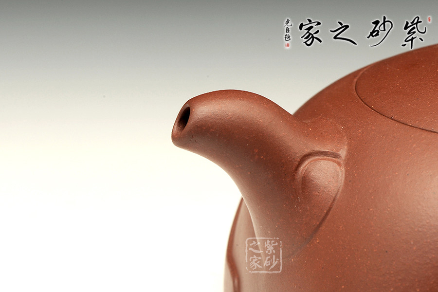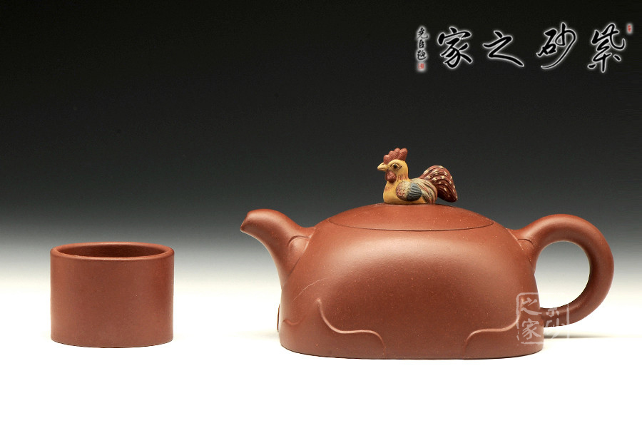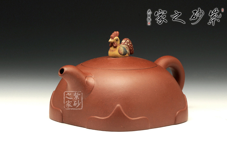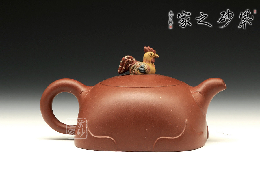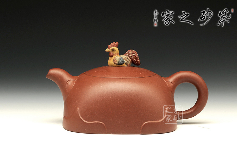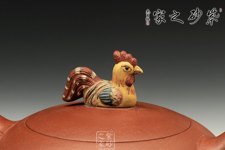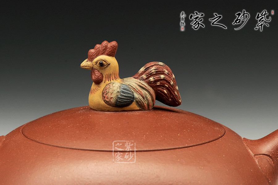 這款壺的造型并無特殊和夸張,而是以質樸、簡約的壺型表現(xiàn)紫砂純凈的魅力,造型優(yōu)美,線條流暢。壺身略扁而平坦,穩(wěn)重大氣。壺嘴精巧細膩,壺基豐厚低垂,嘴口朝上,圓潤無匹。壺把胥出自然,圈把大巧若拙,簡樸至極。整款壺最值得一體的是,壺鈕為一只小雞造型,“雞”同“吉”寓意吉祥,祝福如意,用此品茗,再好不過!