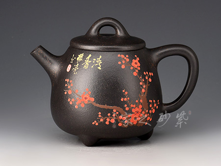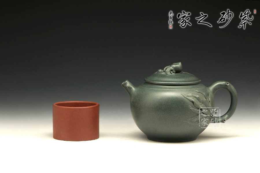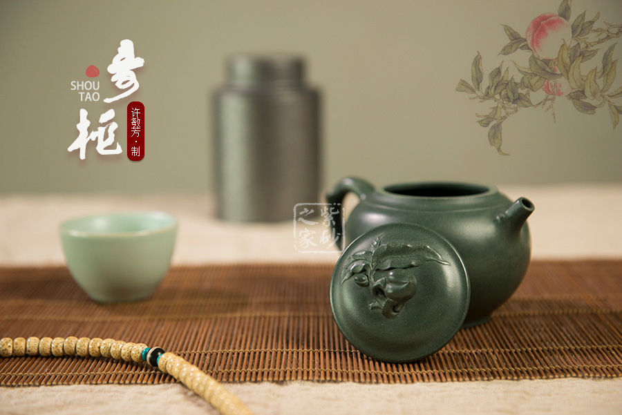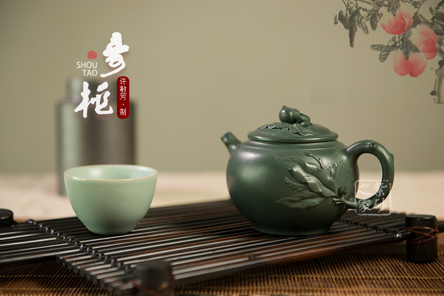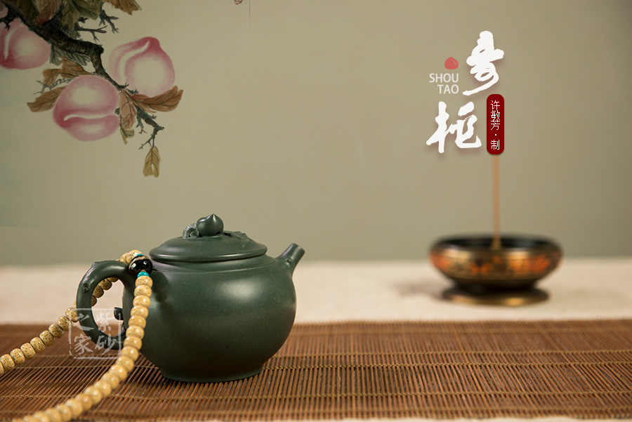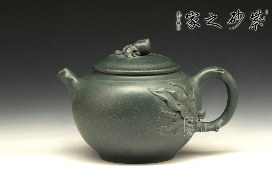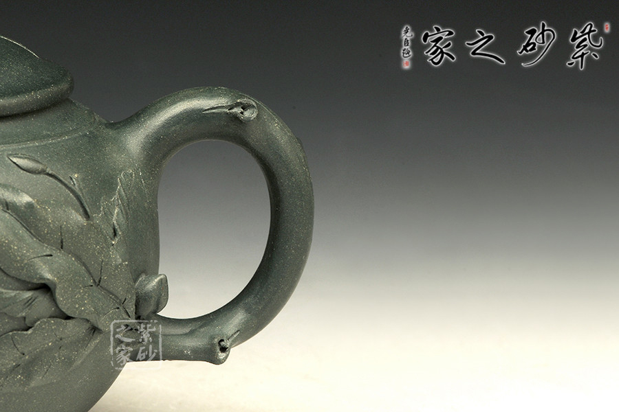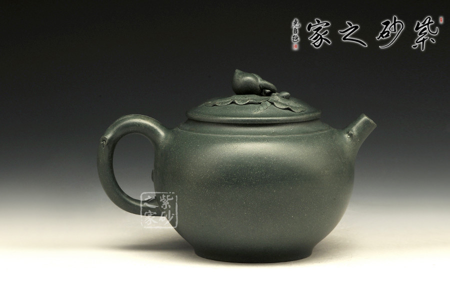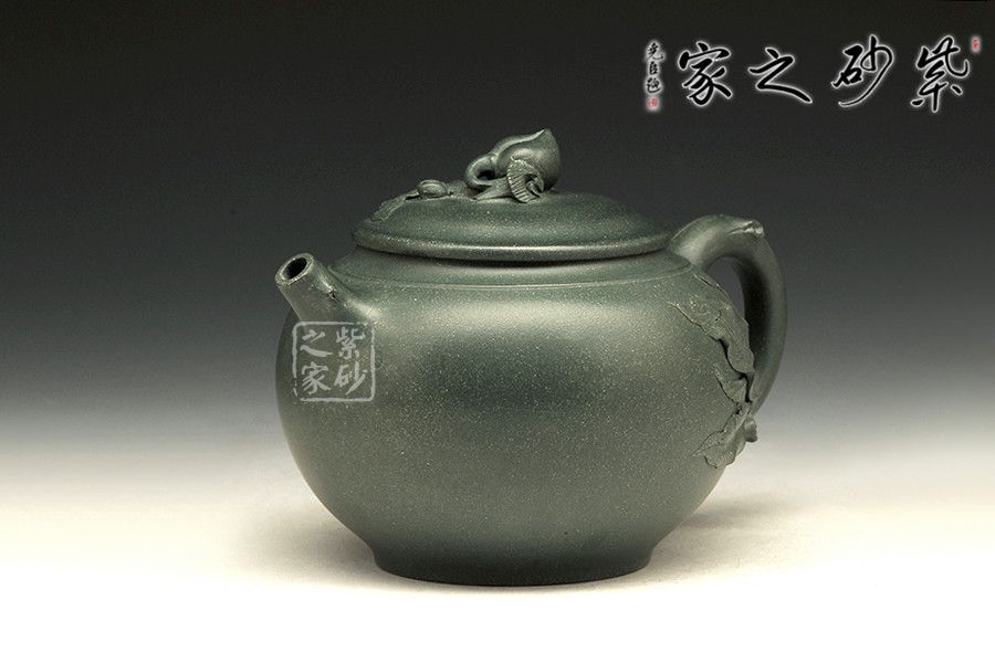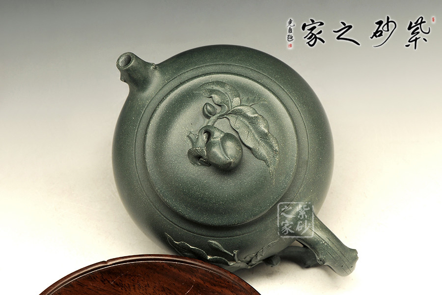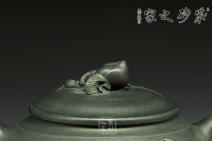 壺身為豐盈的扁圓球型,恰似壽桃的外觀,飽滿的形體讓人難忘,細(xì)膩的表面更惹人喜歡。壓蓋與壺身結(jié)合部位收斂,蓋沿平整光滑,一顆圓滑的小壽桃作壺鈕,精致美妙讓人不由自主地喜歡。小短嘴和耳形把左右對(duì)應(yīng),貫穿壺身的美妙氣質(zhì)綿延不絕。貼花裝飾的兩顆小壽桃還有葉片皆逼真動(dòng)人,帶來(lái)一種想一口吞下的沖動(dòng)。