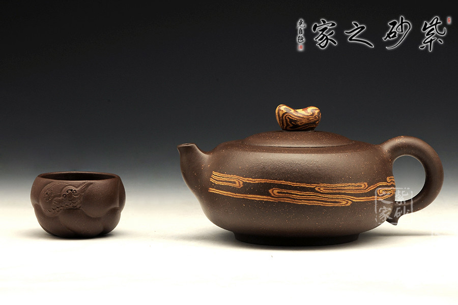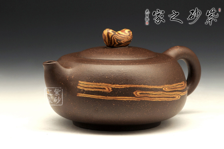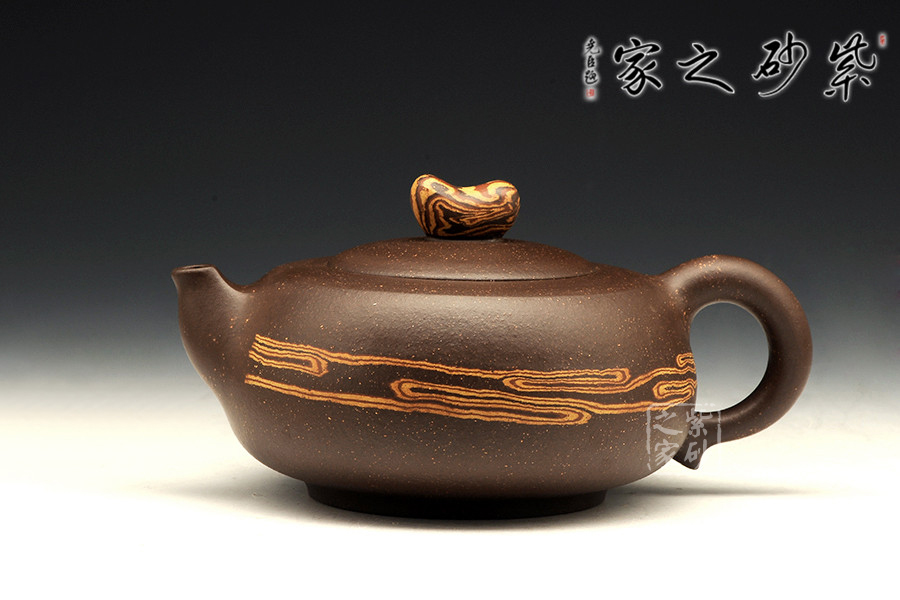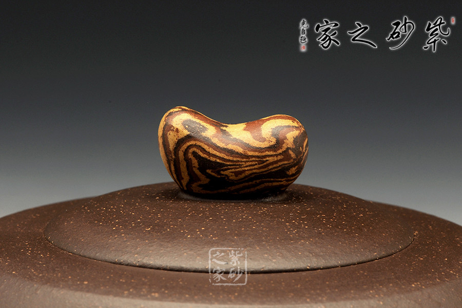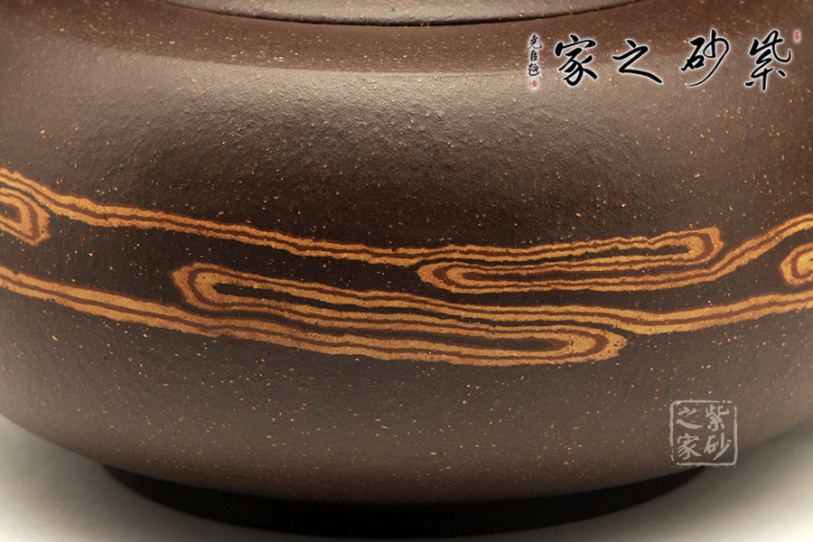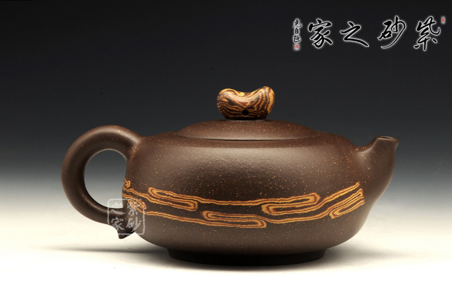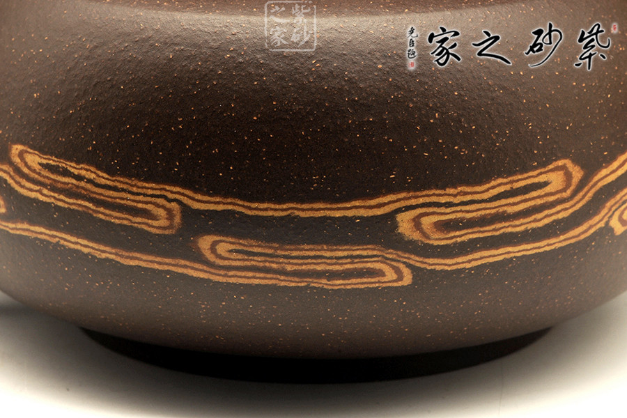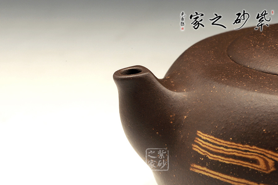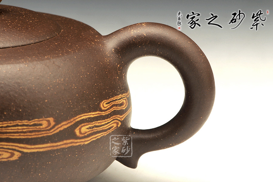 造型上來看,通身扁圓,圈足圓底,使壺身如玉盤一塊。。壺嘴和壺把設(shè)計(jì)簡(jiǎn)潔生動(dòng),壺把留尾,獨(dú)留一段味道,壺嘴短促且有紋路,是短小精致。嵌蓋設(shè)計(jì),蓋平滑樸實(shí),元寶作壺鈕,生動(dòng)形象,造型又樸實(shí)可愛,更添祥瑞氣。
