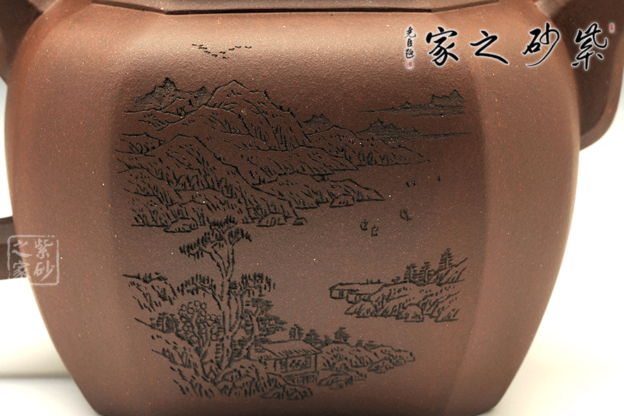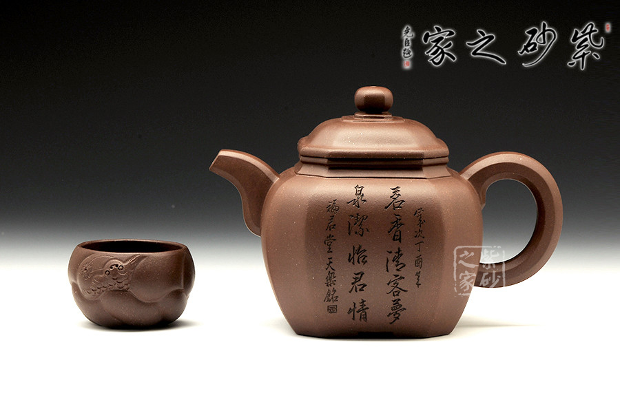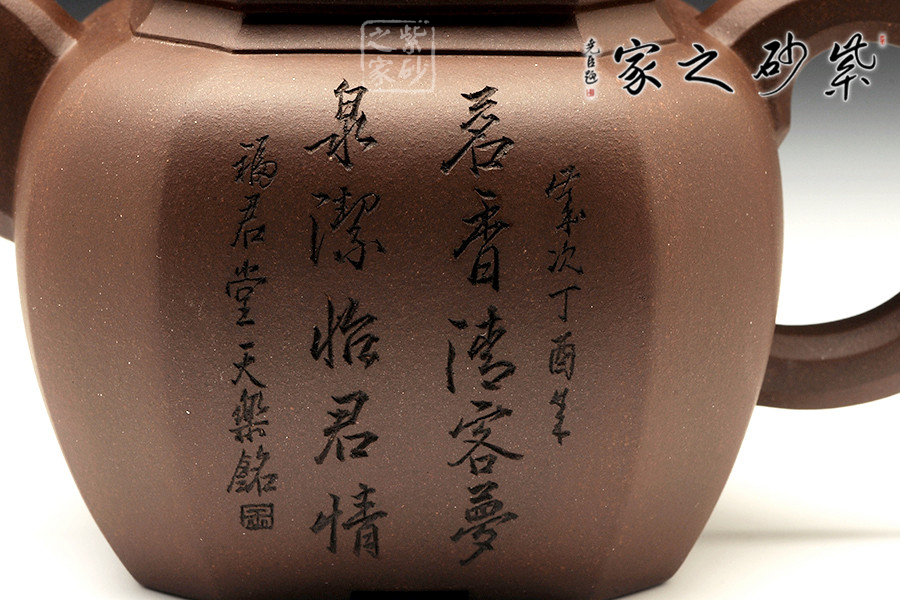 光貨離不開裝飾。俗話說“壺隨字貴,字隨壺傳”:光壺不刻字,就是一把光壺;壺上面刻了大師、名人的字,一把壺的含金量就高了,收藏價值就更高,升值潛力就更大。王福君與中國工藝美術(shù)大師譚泉海合作最多,其次是徐安碧、鮑志強、毛國強(均為中國工藝美術(shù)大師、中國陶瓷藝術(shù)大師)。